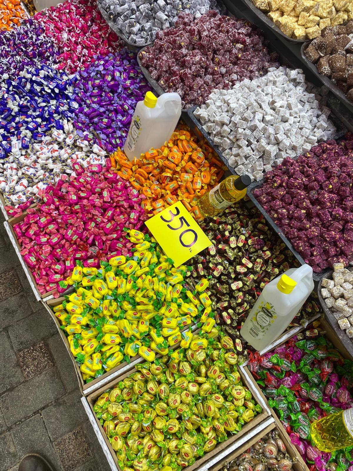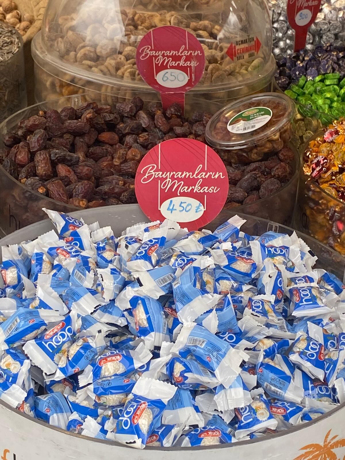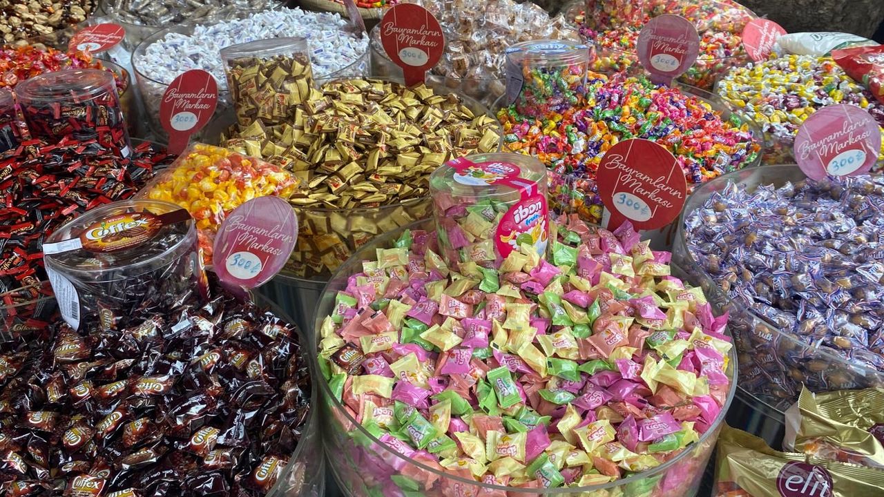 Kapalı Çarşı’daki tezgâhlarda klasik bayram şekerlerinden aromalı akide şekerlerine, meyveli dolgulu şekerlerden yumuşak şekerleme çeşitlerine kadar geniş bir ürün yelpazesi bulunuyor. Özellikle çocukların ilgisini çeken renkli ve aromalı şekerler yoğun ilgi görüyor.