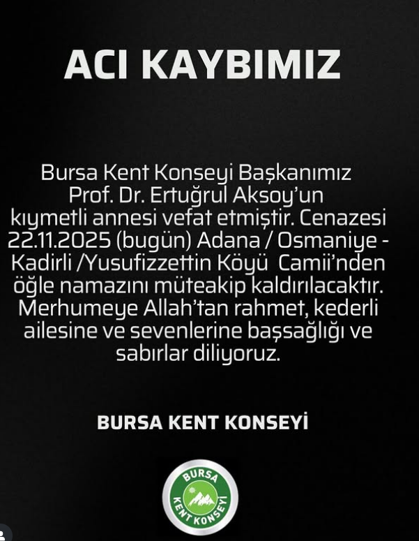 Acı haberi duyuran Bursa Kent Konseyi, yayımladığı taziye mesajında merhumeye Allah’tan rahmet, Aksoy ailesine ve sevenlerine başsağlığı diledi.