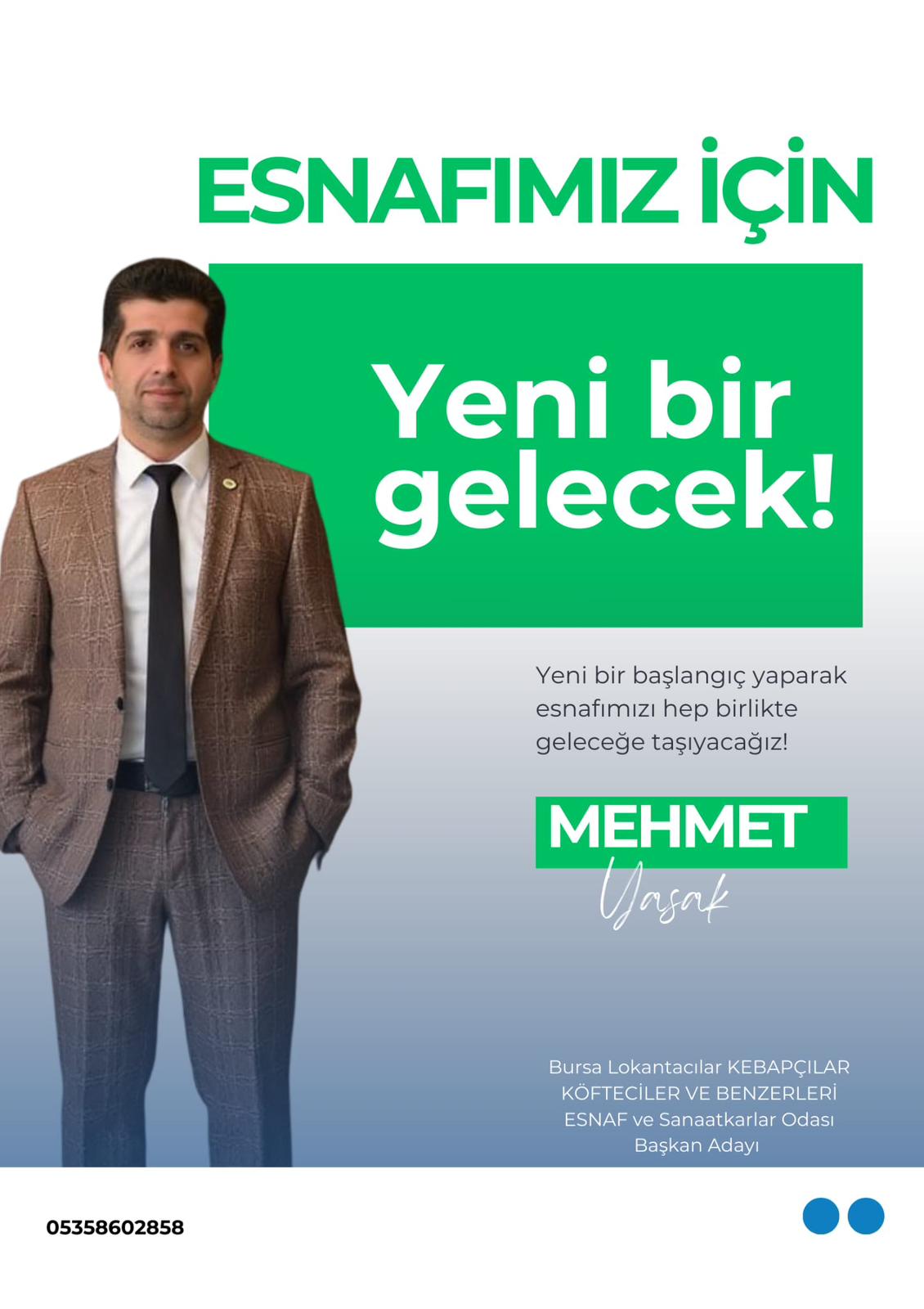 Mehmet Yasak, kampanya sürecinde yalnızca yönetim değişikliği değil, aynı zamanda esnafın ekonomik ve sosyal anlamda güçlenmesini hedefleyen projeler sunuyor. “Birlikte başaracağız” sloganıyla yola çıkan Yasak, sahada aktif bir yönetim anlayışı vaat ediyor. Yasak’a göre oda, üyelerin sorunlarını yerinde tespit eden, çözüm üreten ve ulaşılabilir bir yapıya kavuşmalı.