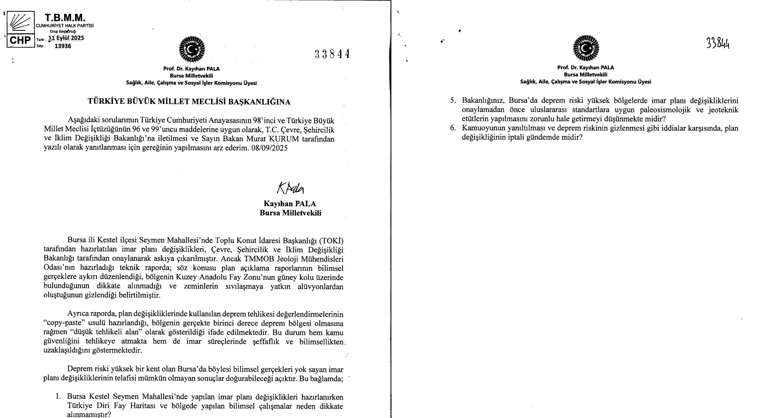 Ankara, 22.12.2025. Cumhuriyet Halk Partisi Bursa Milletvekili ve TBMM Sağlık, Aile, Çalışma ve Sosyal İşler Komisyonu Üyesi Prof. Dr. Kayıhan Pala, Bursa Kestel Seymen Mahallesi’nde Toplu Konut İdaresi (TOKİ) tarafından hazırlanan ve Çevre, Şehircilik ve İklim Değişikliği Bakanlığınca onaylanarak askıya çıkarılan imar planı değişikliklerinin deprem riski ve zemin koşulları bakımından ciddi bir tehdit yarattığını belirtti.