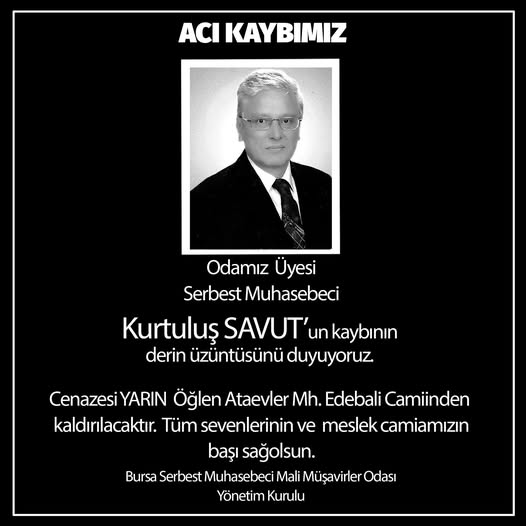 Bursa Serbest Muhasebeci Mali Müşavirler Odası’nın üyesi, Serbest Muhasebeci Kurtuluş Savut hayatını kaybetti. Savut’un vefatı, ailesi, yakınları ve meslek camiasında derin üzüntüye neden oldu.