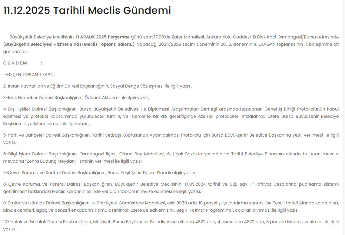 Bursa Büyükşehir Belediyesi 11 Aralık günü gerçekleşecek meclis gündemide, tarihi Setbaşı Köprüsü ile ilgili Park ve Bahçeler Dairesi Başkanlığı tarafından gönderilen bir yazı da bulunuyor. Yazıda, köprünün aydınlatılması için gerekli protokolün imzalanması amacıyla Büyükşehir Belediye Başkanı Mustafa Bozbey’e yetki verilmesi talep edildi.