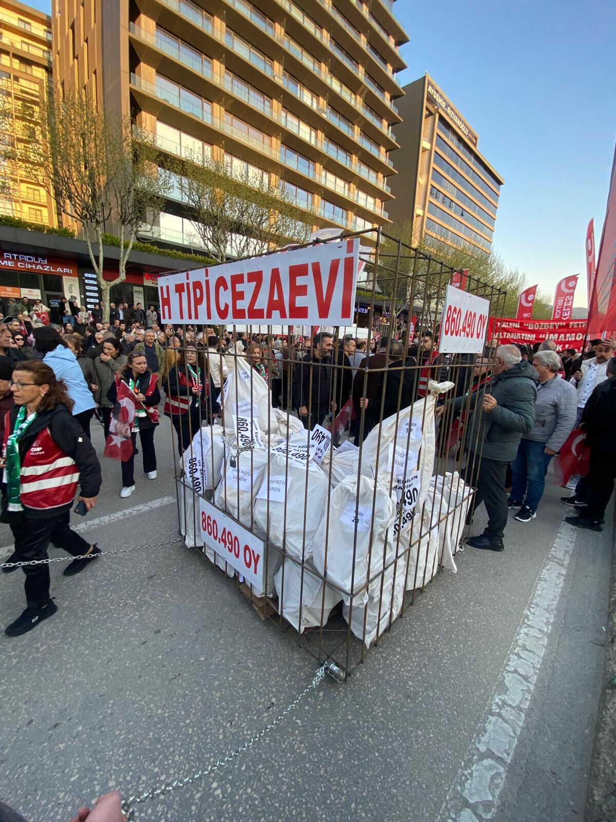 Yürüyüşte en çok dikkat çeken detaylardan biri, Bursa H Tipi Cezaevi’ni simgeleyen maket oldu. Demir parmaklıklar içine yerleştirilen oy torbalarıyla oluşturulan sembolik düzenek, “halkın iradesinin cezaevinde olduğu” mesajını vermek amacıyla hazırlandı.