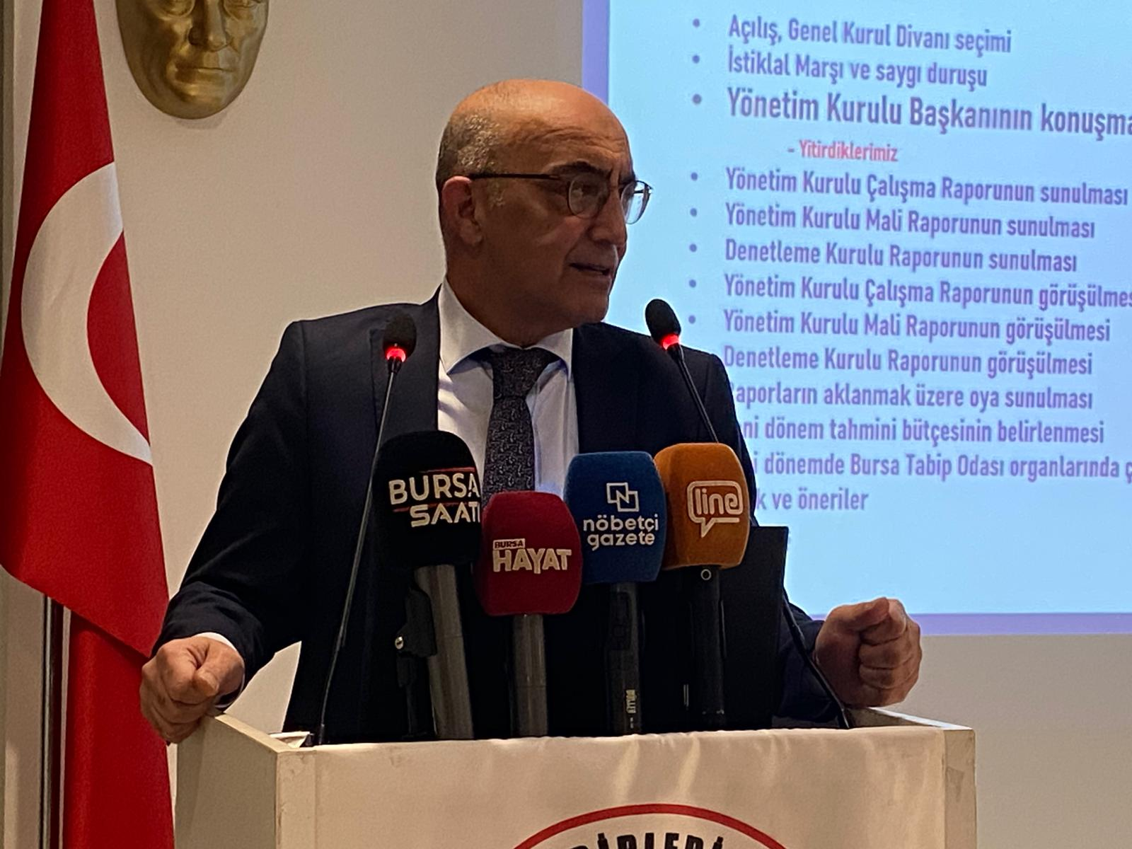Bursa Tabip Odası Başkanı Kadir Binbaş, genel kurulun açılışında yaptığı konuşmada sağlıkta şiddetin gündemden düşmediğine dikkat çekti. Beyaz kod verilerinin önceki yıllardan çok farklı olmadığını belirten Binbaş, “Sağlıkta şiddet hâlâ devam ediyor. Bu konuda mücadeleyi sürdürmek zorundayız” dedi.