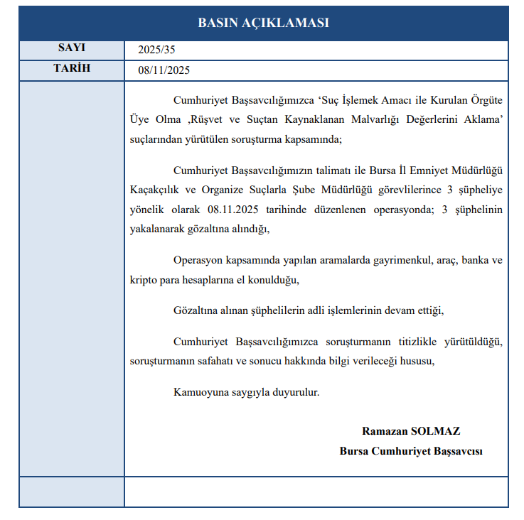 Bursa Cumhuriyet Başsavcılığı, 08.11.2025 tarihli açıklamasında operasyonun ayrıntılarını kamuoyuyla paylaştı. Açıklamada, soruşturmanın “Suç İşlemek Amacıyla Kurulan Örgüte Üye Olma, Rüşvet ve Suçtan Kaynaklanan Malvarlığı Değerlerini Aklama” suçları kapsamında sürdüğü belirtilerek şu bilgilere yer verildi: