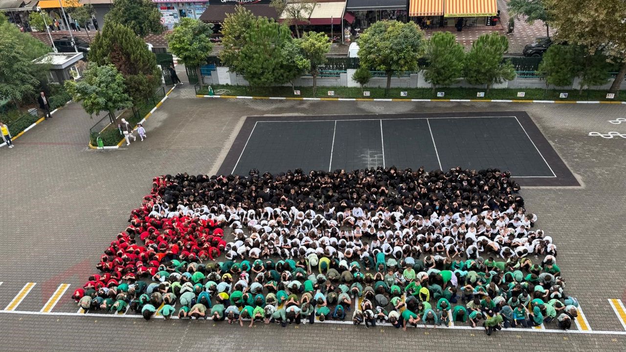Etkinlik kapsamında öğrenciler, Filistin bayrağının renklerini taşıyan kıyafetler giyerek barış, kardeşlik ve dayanışma mesajı verdi. El ele vererek oluşturulan dev Filistin bayrağı, okul bahçesini adeta bir barış sahnesine dönüştürdü.