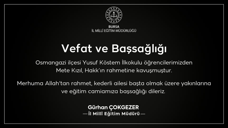 Bursa İl Milli Eğitim Müdürlüğü tarafından yapılan açıklamada, Mete Kızıl’ın vefatı dolayısıyla ailesi başta olmak üzere yakınlarına ve tüm eğitim camiasına başsağlığı dilekleri iletildi.