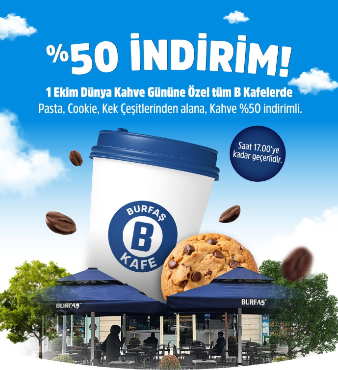 BURFAŞ, 1 Ekim Dünya Kahve Günü’nü özel kentin birçok noktasında hizmet veren B Kafe’lerde, pasta, cookie ve kek çeşitlerinden alanlara kahve yüzde 50 indirimli sunulacak.
