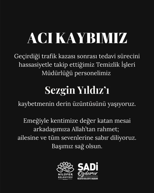 Nilüfer Belediyesi tarafından paylaşılan taziye mesajında, Sezgin Yıldız’ın kaybından duyulan derin üzüntü dile getirilirken, merhumun emeğiyle kente değer kattığı vurgulandı. Açıklamada, ailesine ve tüm sevenlerine başsağlığı mesajı iletildi.