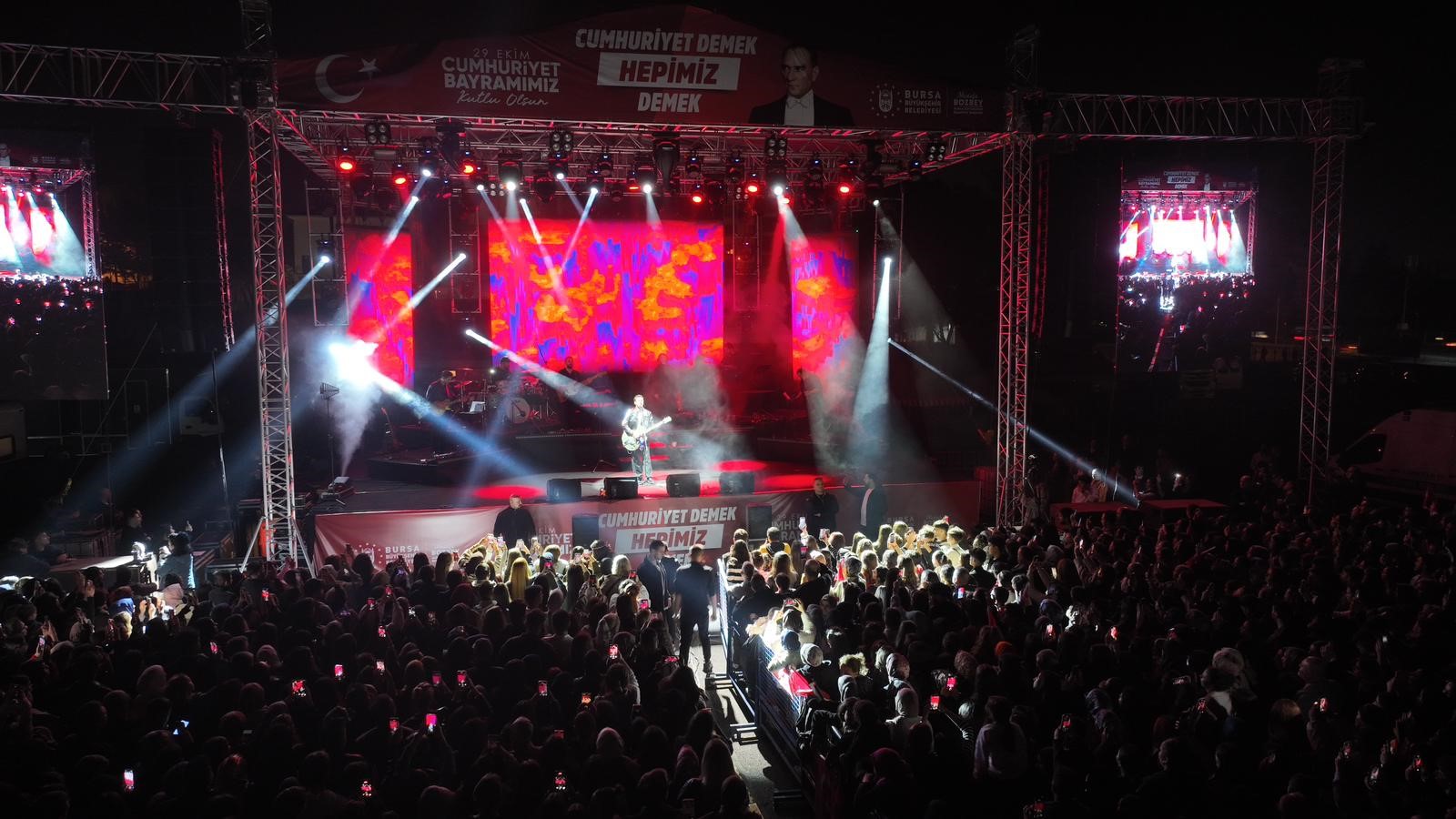 Ulu Önder Mustafa Kemal Atatürk'ün "Benim en büyük eserim" dediği Cumhuriyet'in değerlerini Bursa’nın her bir köşesine taşıyan Büyükşehir Belediyesi, düzenlediği konserlerde sevilen sanatçıları Bursalılarla buluşturmaya devam ediyor. Etkinlikler kapsamında Gürsu’da Kubat ile Cumhuriyet coşkusunu vatandaşlara yaşatan Büyükşehir Belediyesi, Yıldırım ilçesinde de ünlü sanatçı Buray’ı sevenleriyle bir araya getirdi. Eski İhtisas Hastanesi Alanı’nı dolduran binlerce Bursalı, ellerindeki Türk bayraklarıyla sanatçının şarkılarına hep bir ağızdan eşlik etti. Vatandaşlara unutulmaz bir gece yaşatan Buray, seslendirdiği marşlarla da Cumhuriyet heyecanını Yıldırım’da yaşattı.