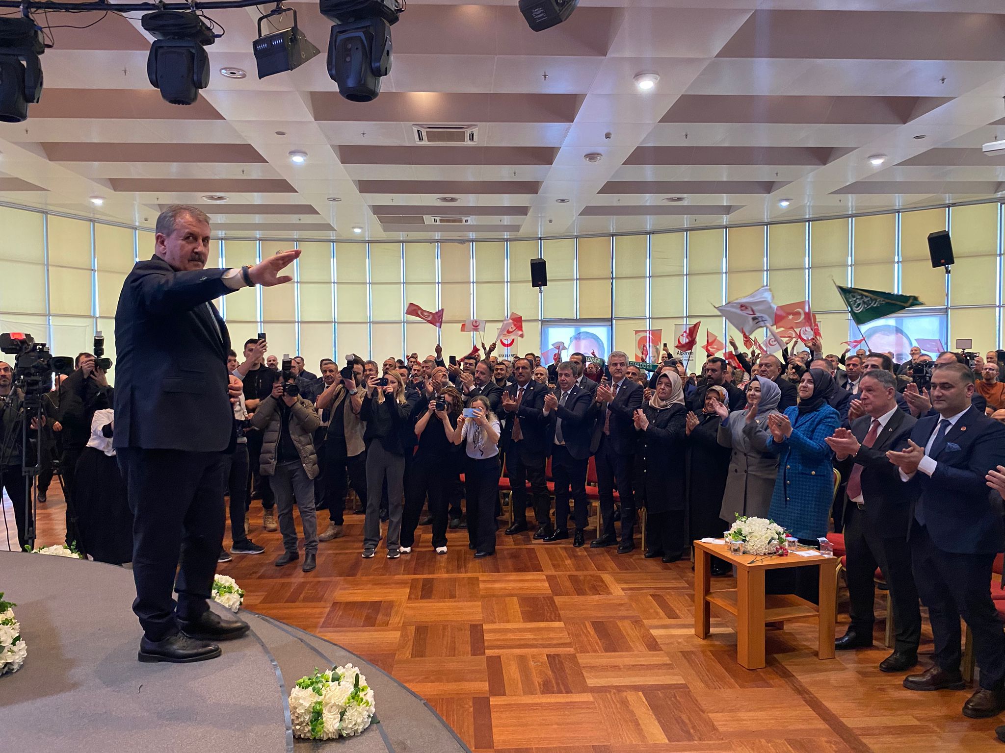 Destici, protokole ve kadın basın mensuplarına karanfil takdim ederek salonu selamladı.