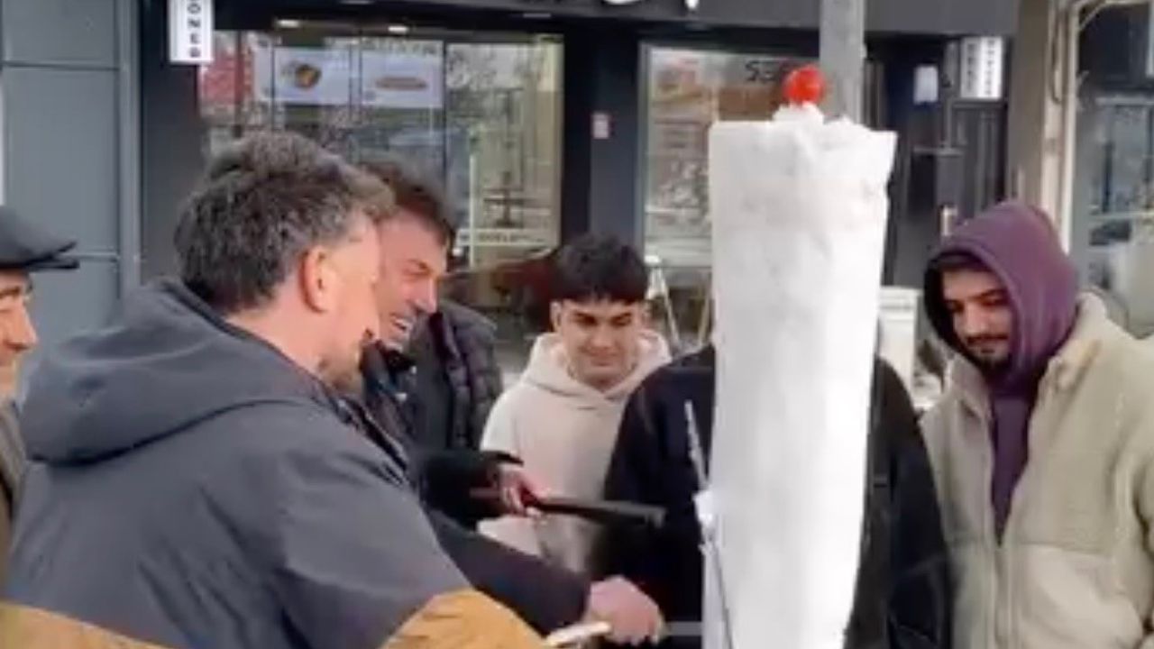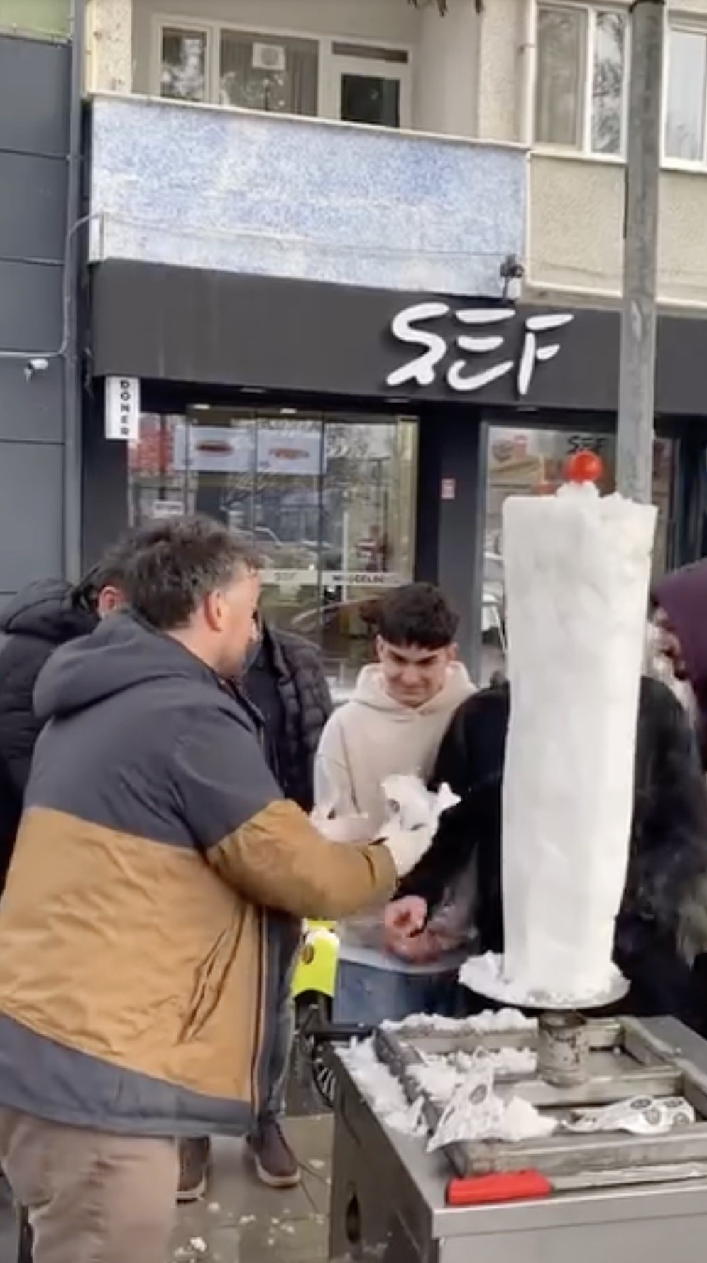 Dağdan topladığı kar kütlesini döner şişine takan Güneş, iş yerinin önünde toplanan vatandaşlara "kardan döner" ikramında bulundu.