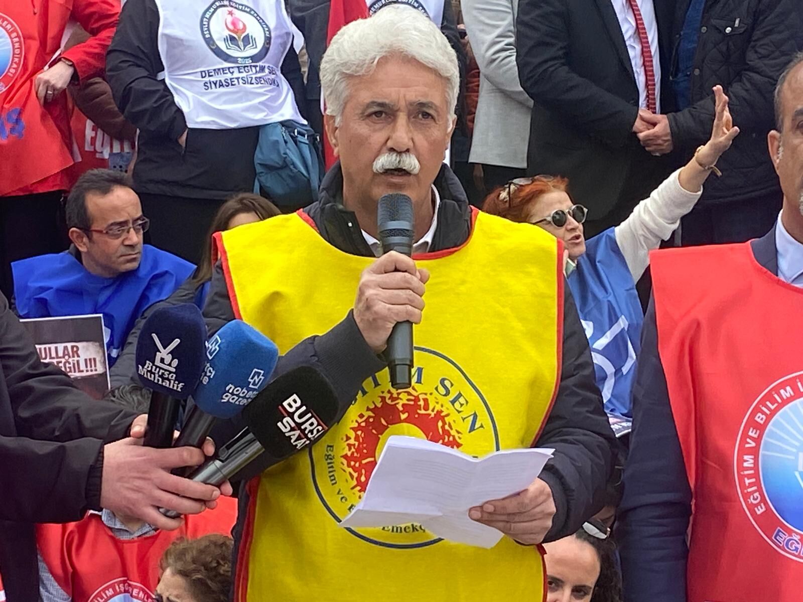 “Öğretmen susarsa toplum susar, öğretmen korkarsa gelecek kararır. Ama biz susmayacağız, korkmayacağız” dedi.