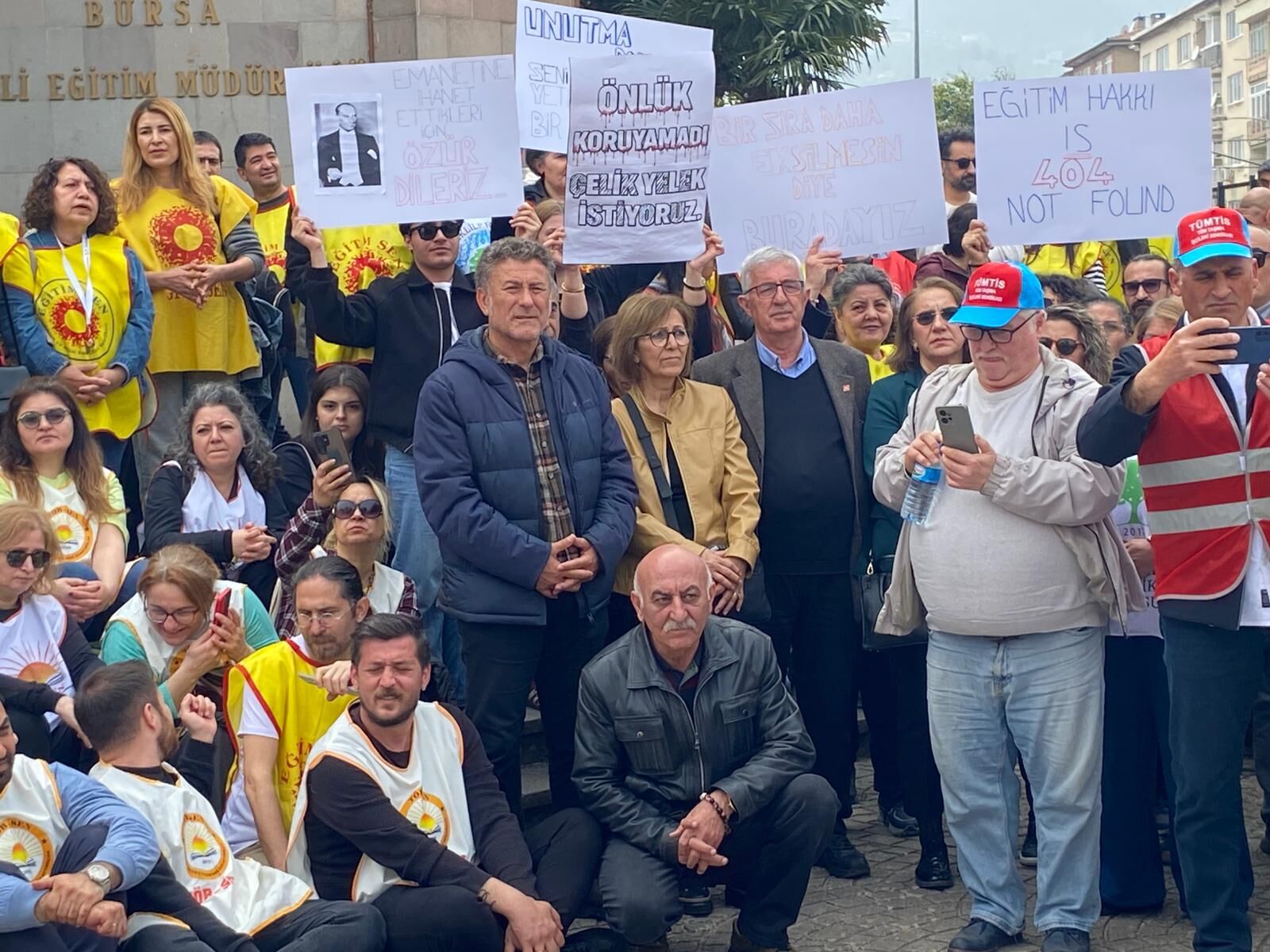 Bursa’da İl Milli Eğitim Müdürlüğü önünde gerçekleştirilen eylemde çok sayıda sendika, öğrenci topluluğu ve sivil toplum kuruluşu bir araya geldi.