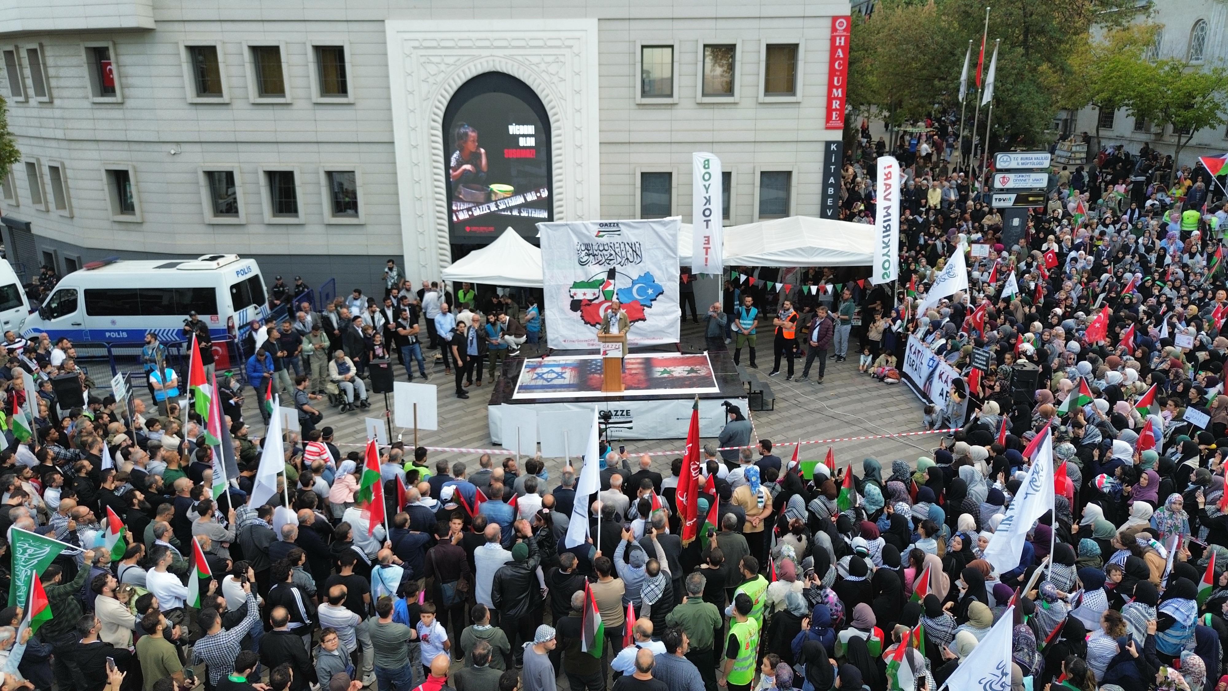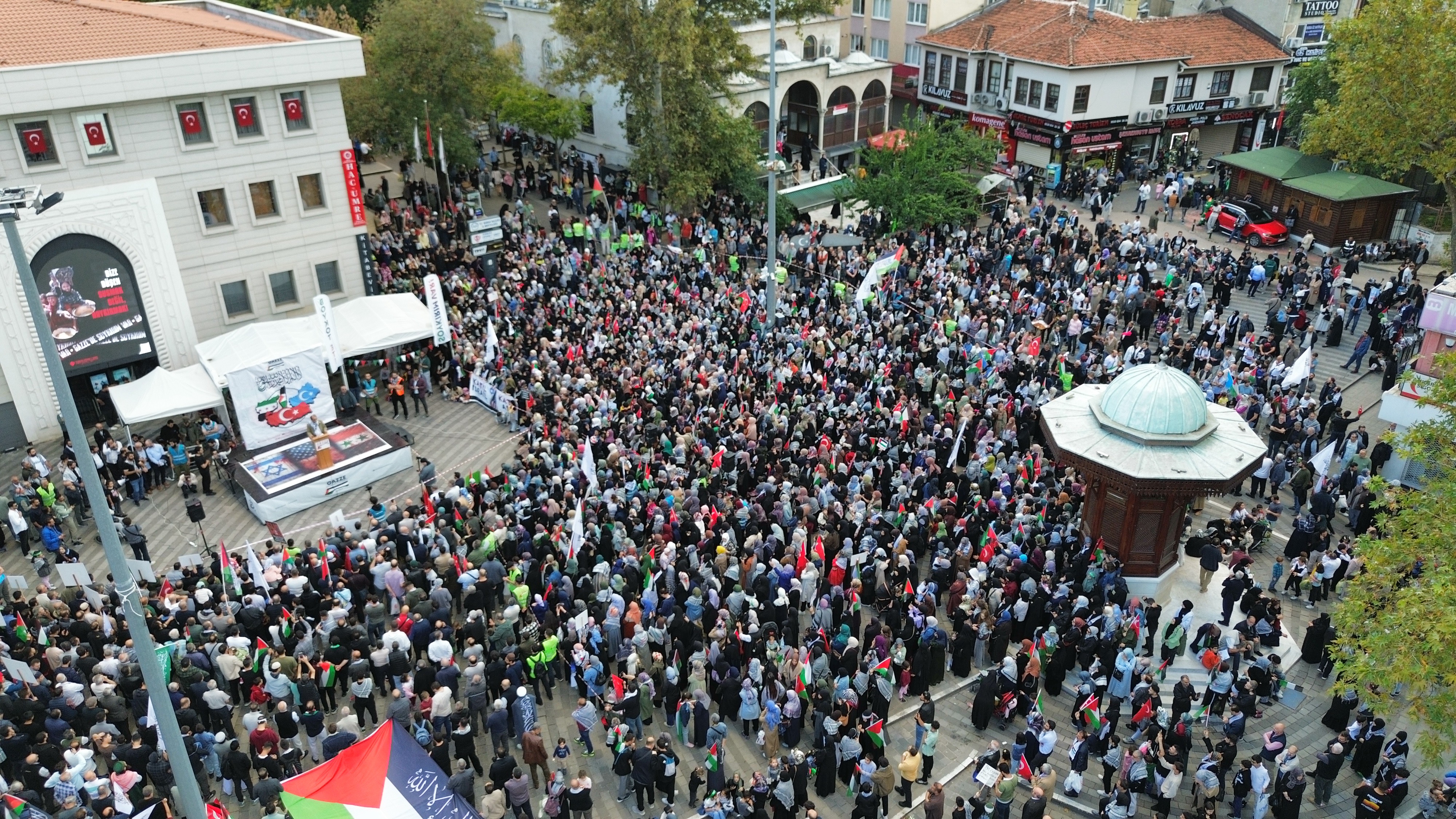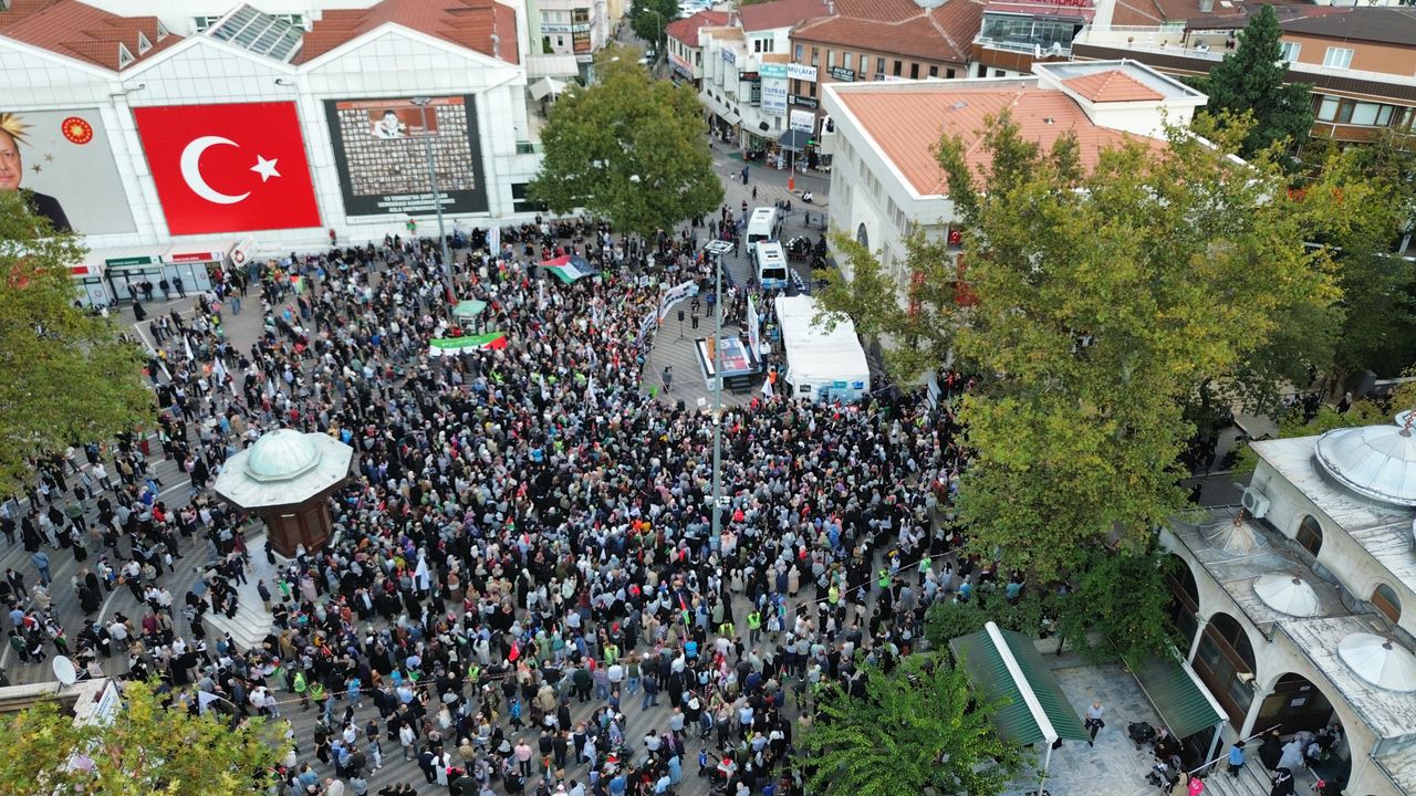 Filistin'e Destek Platformu çatısı altında bir araya gelen binlerce kişi Bursa'da 15 Temmuz Demokrasi Meydanı önünde toplandı.