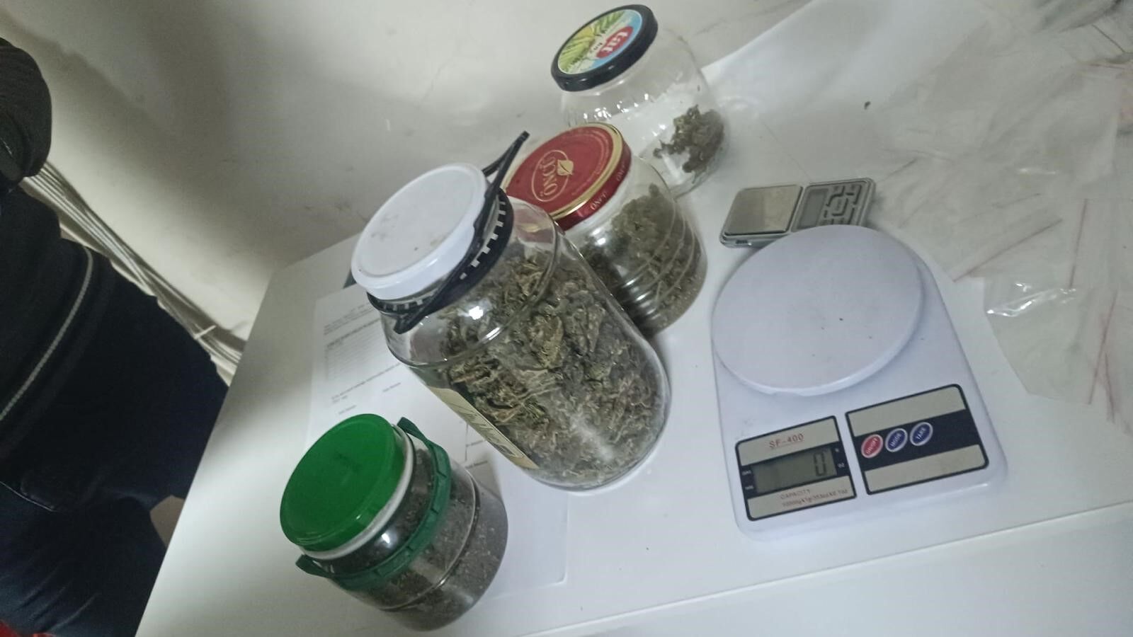Evde yapılan aramalarda; 2 adet ruhsatsız tabanca, 67 adet fişek, 5 parça halinde toplam 728 gram esrar, 9 parça halinde 146 gram esrar tohumu, 2 kök hint keneviri, 86 adet şeffaf kilitli poşet, 1 adet havalı tüfek ve 2 adet hassas terazi ele geçirildi.