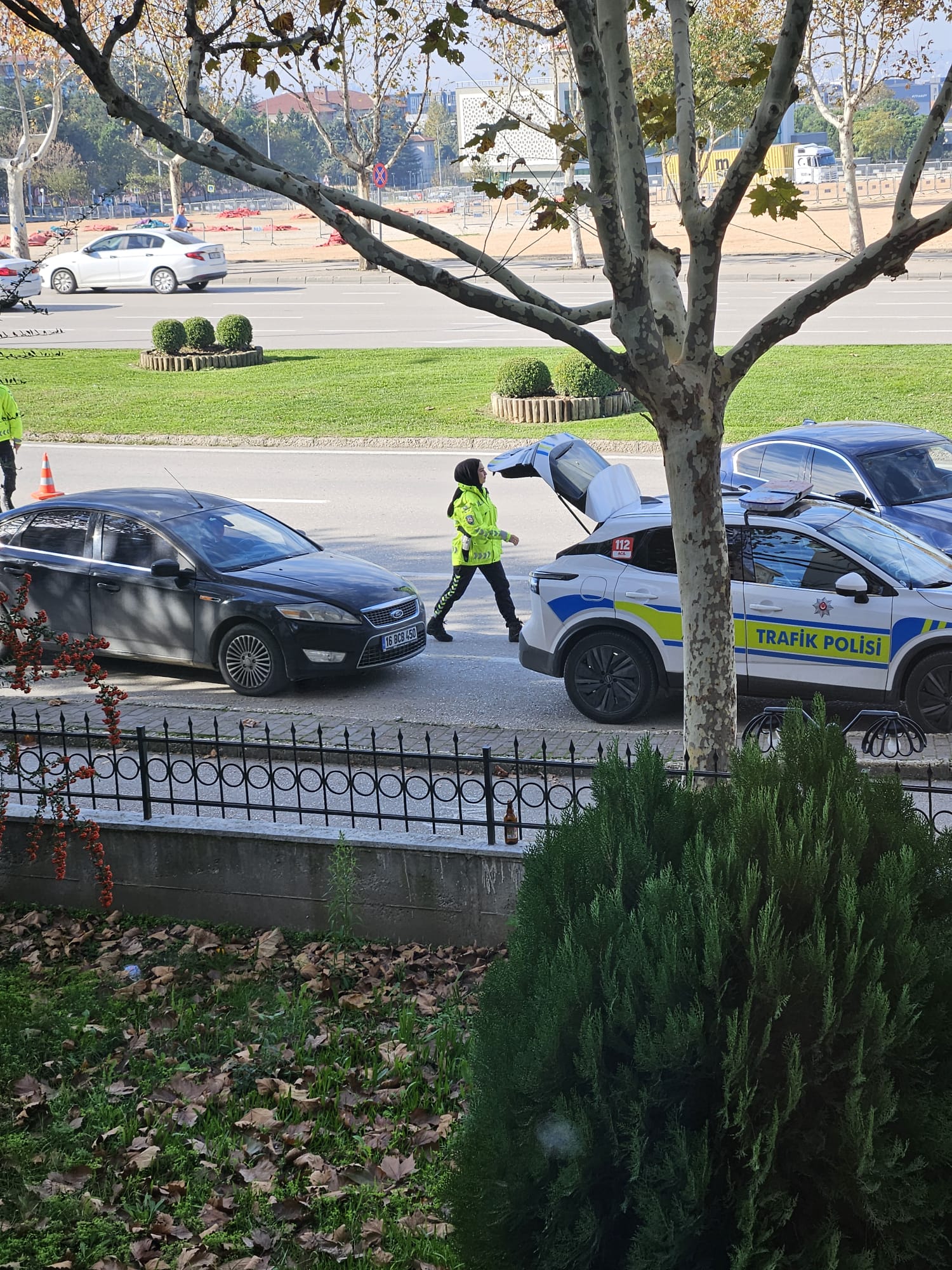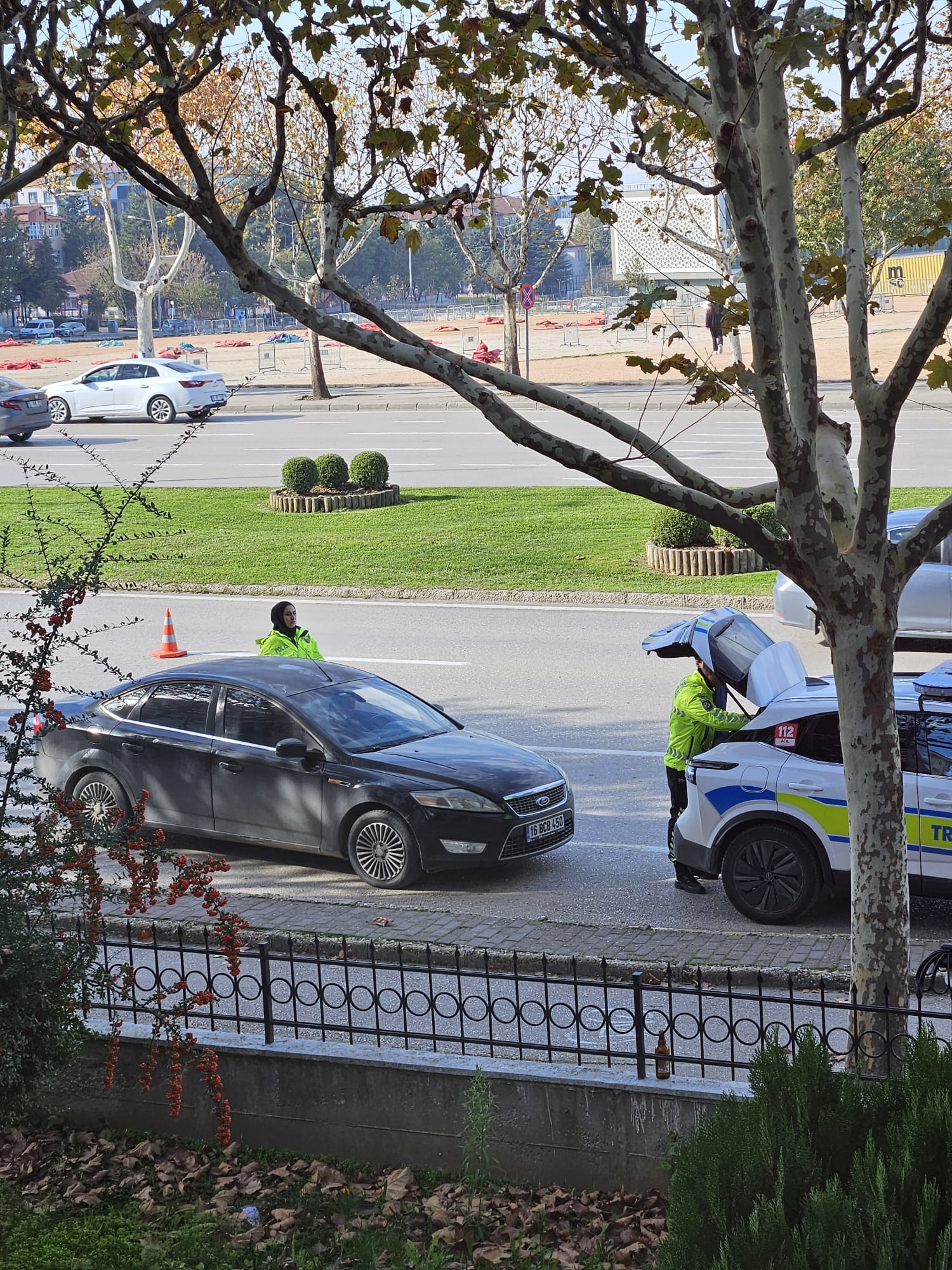 Polis ekiplerinin sürücülerden kimlik ve ruhsat bilgilerini aldığı, araçlarda rutin incelemeler yaptığı görüldü.
