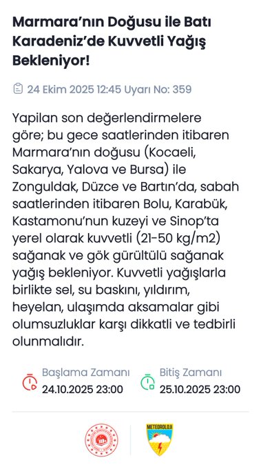 Meteoroloji verilerine göre yağışların 24 Ekim Cuma 23.00’ten itibaren başlayıp 25 Ekim Cumartesi 23.00’e kadar etkili olması öngörülüyor.
