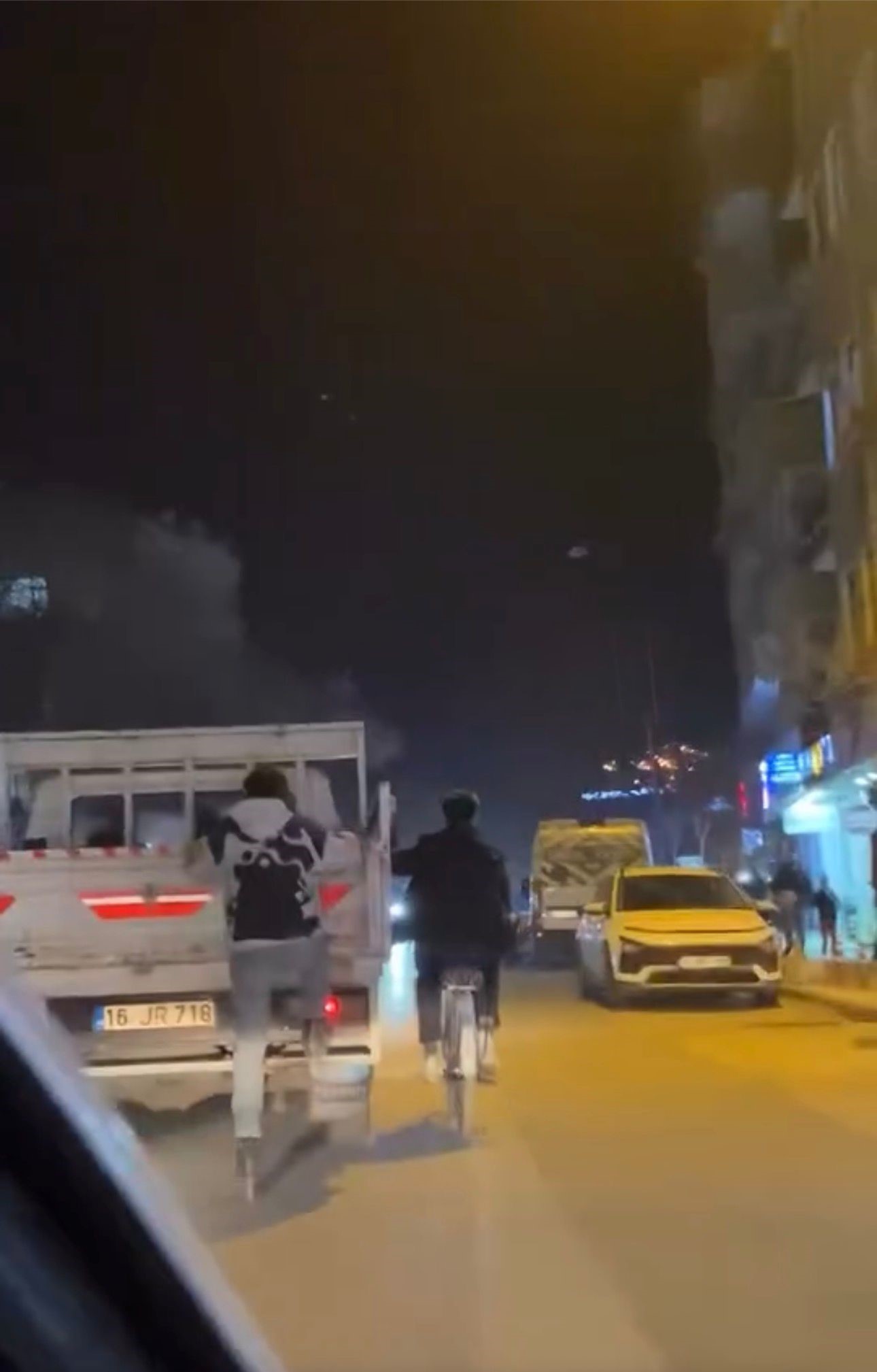 Olay, Yenice Mahallesi Nuri Doğrul Caddesi üzerinde meydana geldi. Edinilen bilgilere göre, patenli ve bisikletli iki genç, seyir halindeki bir kamyonetin arkasına tutunarak ilerlemeye başladı. Trafiği ve kendi can güvenliklerini hiçe sayan gençler, bir süre bu şekilde yolculuk etti.