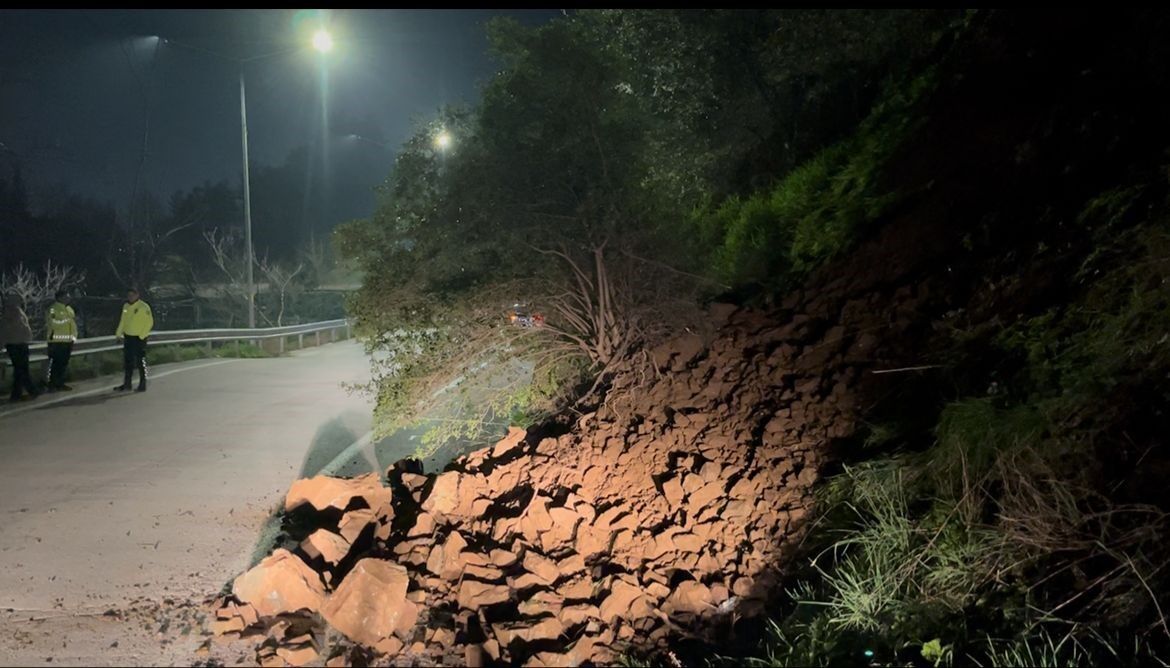 İstinat duvarının olmaması nedeniyle kopan kayalar yola savrulurken, o sırada bölgeden geçen bir sürücü, ani manevra yaparak kaza yapmaktan kurtuldu.