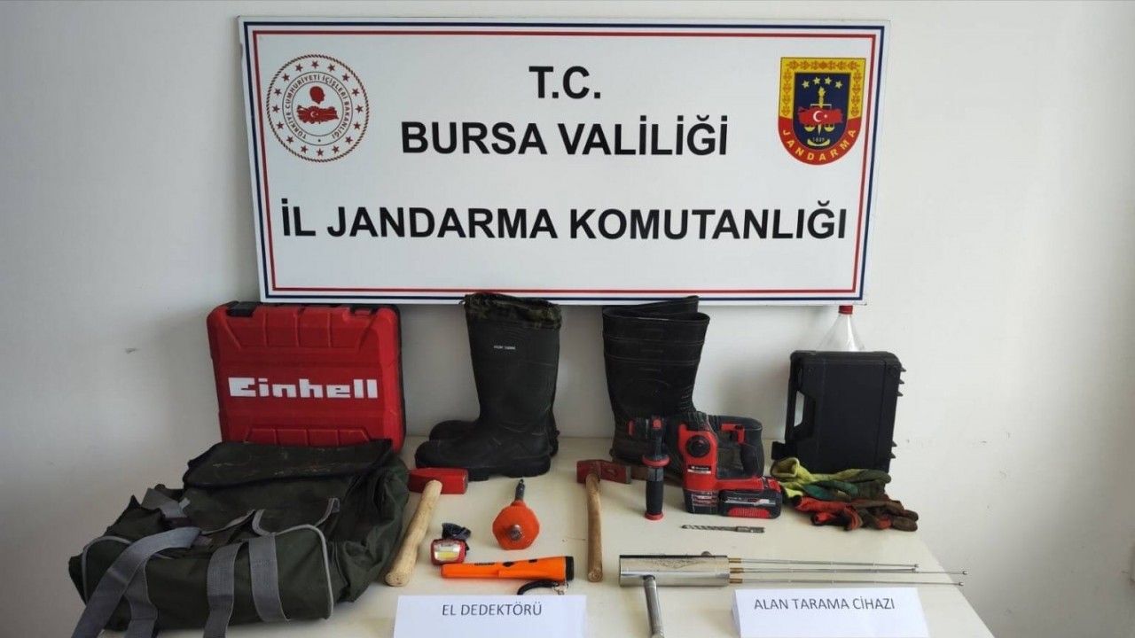 Şüpheliler Murat Ş. (40) ve Mahmut E. (20) gözaltına alınırken, kazı için kullandıkları tarama cihazı, el dedöktörü, kazma, çekiç, elektrikli matkap ele geçirildi.
