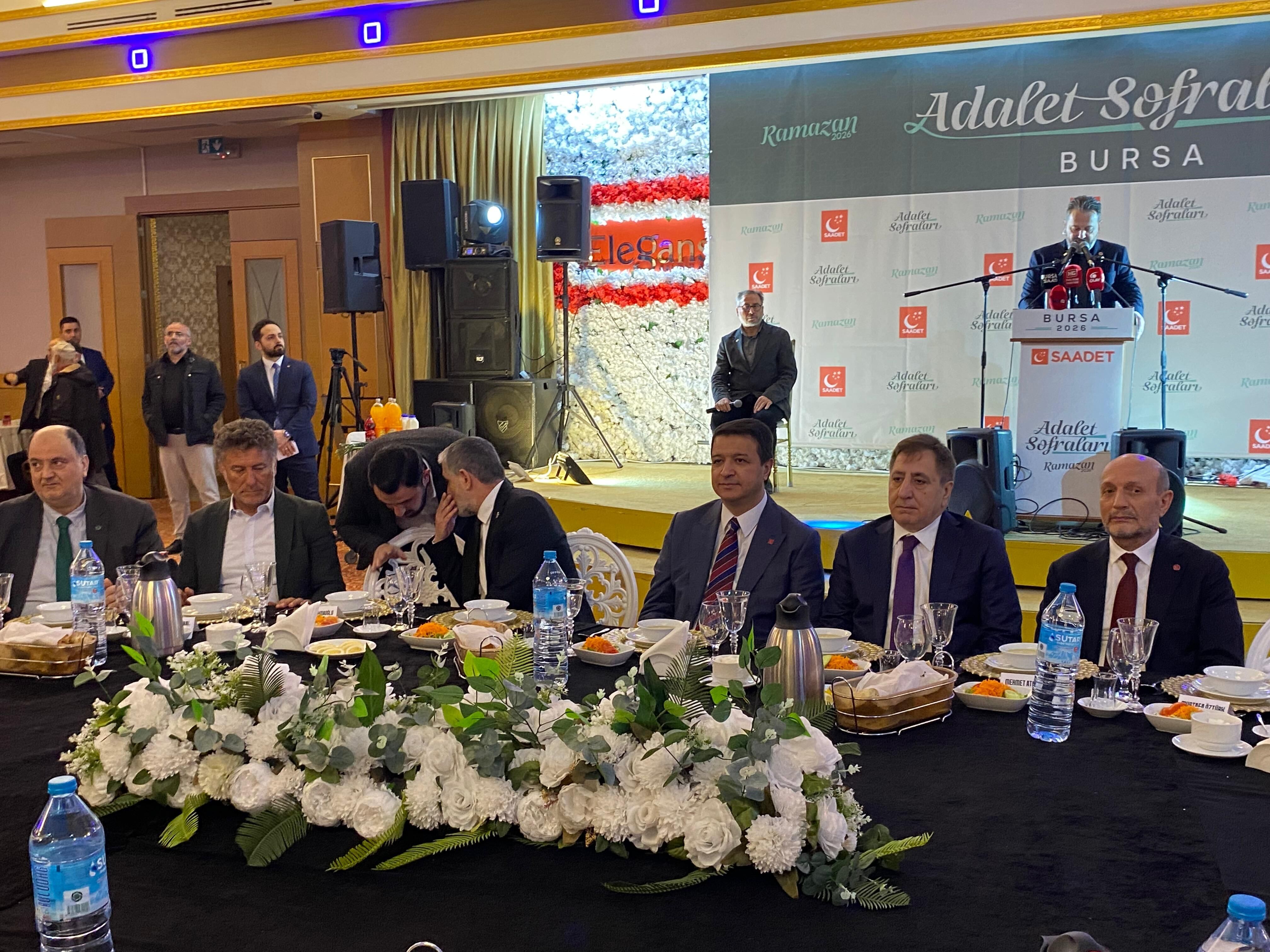 Genel Başkan Mahmut Arıkan’ın da katıldığı Saadet Partisi iftarına yoğun katılım vardı. Konuklar hariç parti teşkilat mensuplarının para ödeyerek geldiği iftarda protokol masasında neredeyse her siyasal parti vardı. CHP Milletvekili Orhan Sarıbal, İl Başkanı Nihat Yeşiltaş, Gemlik Belediye Başkanvekili Şükrü Aksu ile temsil edildi. Yeni Yol Partisi Genel Başkanı İzzettin Küçük, DEVA Partisi İl Başkanı Tayfun Öztürk, Vatan Partisi İl Başkanı Dilek Çınar iftara katılan isimler arasındaydı.