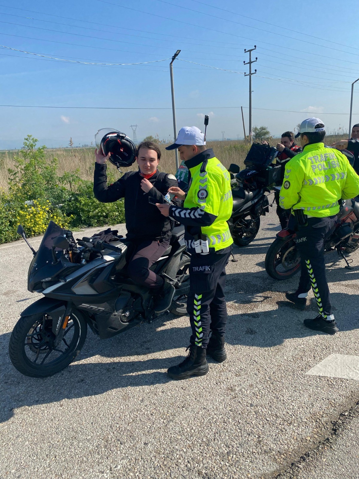 Karacabey Bölge Trafik Denetleme İstasyon Amirliği ekipleri, Bursa-İzmir karayolu üzerinde motosiklet sürücülerine yönelik denetimler gerçekleştirdi. Yapılan uygulamada kurallara uymayan sürücülere 52 bin 853 TL cezai işlem uygulandı.