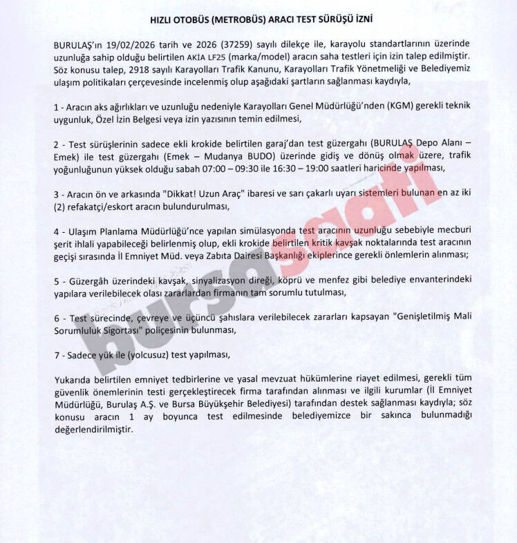Karara göre test sürüşleri, BURULAŞ Depo Alanı – Emek ile Emek – Mudanya (BUDO) hattı arasında gidiş-dönüş şeklinde yapılacak. Uygulama kapsamında araçlar, şehir içi trafik akışını olumsuz etkilememek adına sabah 07.00–09.30 ve akşam 16.30–19.00 saatleri dışında yollarda olacak.