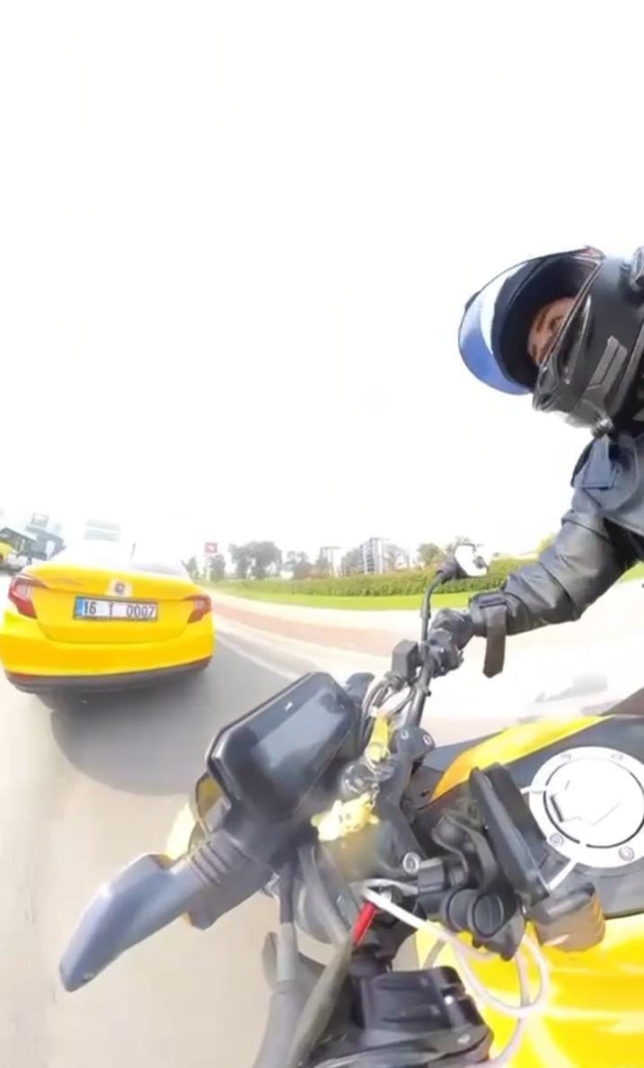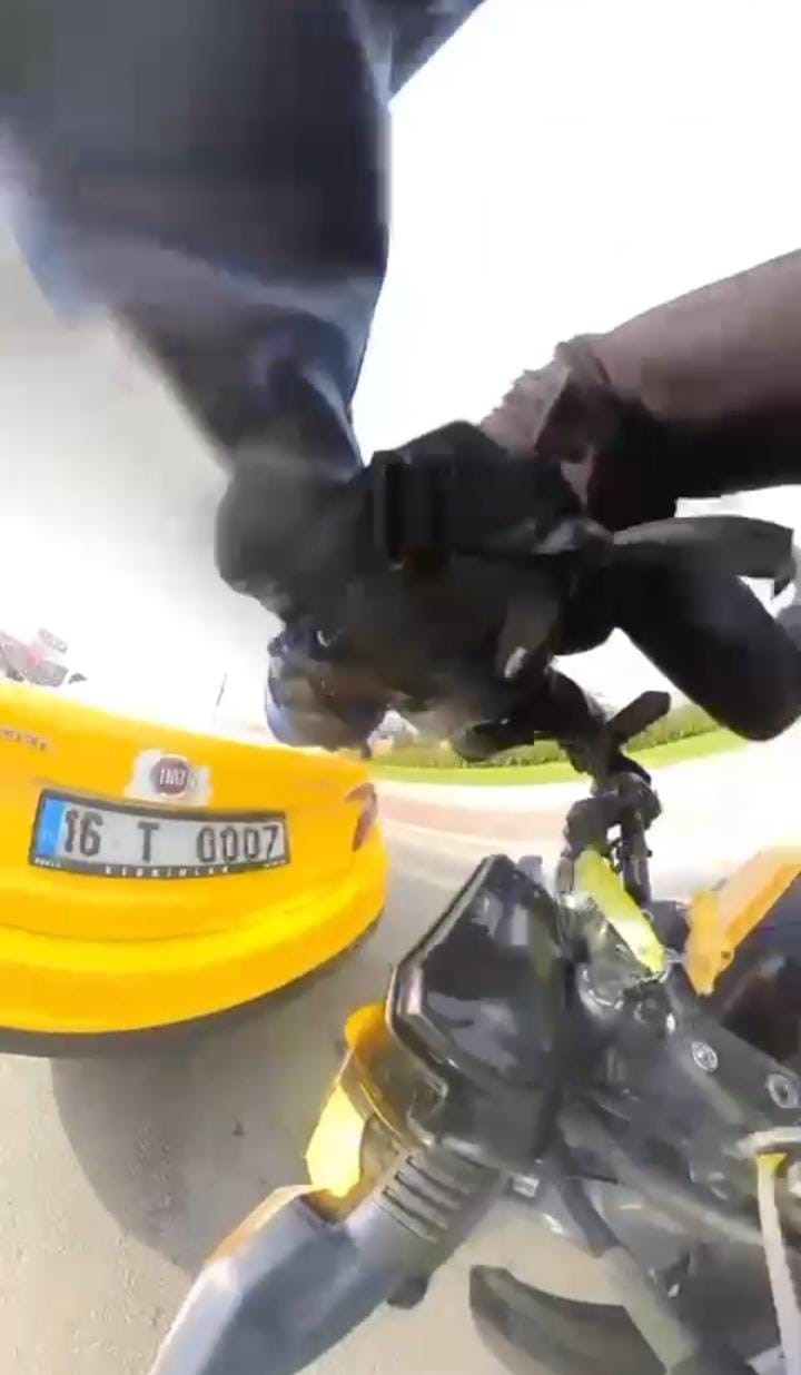 Kaza dün öğle saatlerinde Nilüfer ilçesinde meydana geldi. Trafikte seyreden motosiklet sürücüsü, etrafına baktığı sırada trafik durdu. Önünde duran ticari taksiyi fark etmeyen motosiklet sürücüsü taksiye arkadan çarparak devrildi. O anlar motosiklet sürücüsünün aksiyon kamerasına yansıdı.