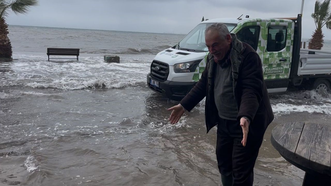 Gemlik'e bağlı Kurşunlu Mahallesi'nde sabah saatlerinde etkisini artıran fırtına sonrası deniz taştı. Sahil şeridindeki işletmeler kapılarını açamazken, deniz suyu kumları da beraberinde getirerek iş yerlerinin girişine kadar dayandı.