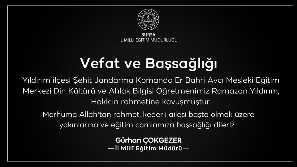 Bursa İl Milli Eğitim Müdürlüğü tarafından yayımlanan başsağlığı mesajında, merhuma Allah’tan rahmet, ailesine, yakınlarına ve eğitim camiasına başsağlığı dilendi.
