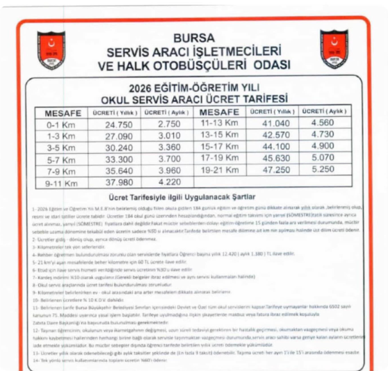 Açıklamada, ücretlerin KDV dahil olduğu, gidiş-dönüş üzerinden hesaplandığı ve servis şoförlerinin belirlenen tarife dışında ek ücret talep edemeyeceği vurgulandı.