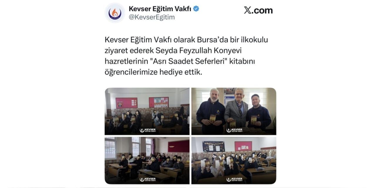 Vakfın sosyal medya platformu X üzerinden yaptığı paylaşımda, “Kevser Eğitim Vakfı olarak Bursa’da bir ilkokulu ziyaret ederek Seyda Feyzullah Konyevi hazretlerinin ‘Asrı Saadet Seferleri’ kitabını öğrencilerimize hediye ettik” ifadelerine yer verildi. Paylaşımda öğrencilerin ellerinde kitaplarla çekilmiş fotoğrafları da yer aldı.
