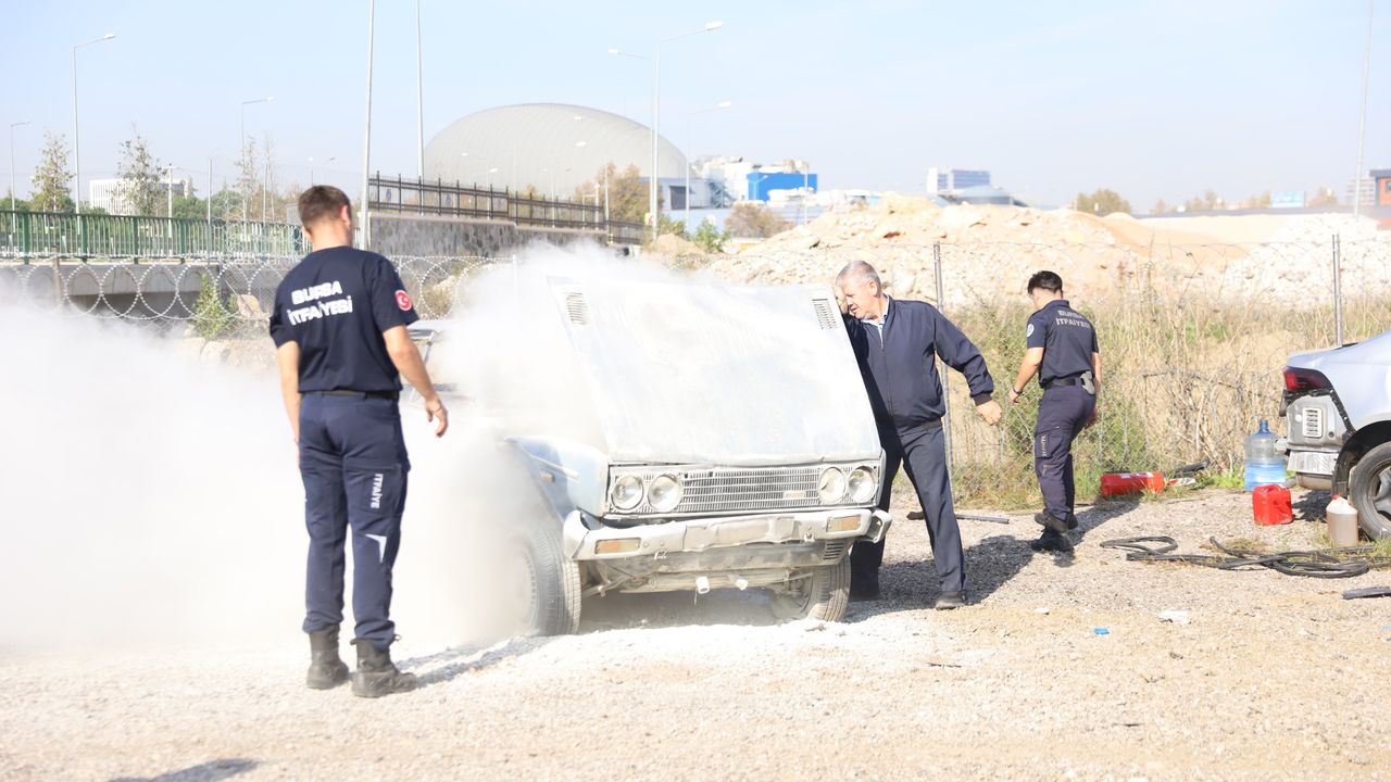 Uzmanlar tarafından araç üzerinde teorik bilgiler alan şoförler, eğitim sahasında bulunan hurda araçlar üzerinde de söndürme işlemi gerçekleştirdi.