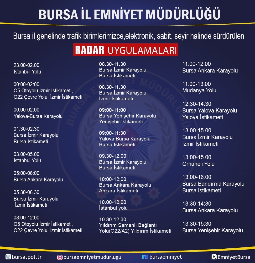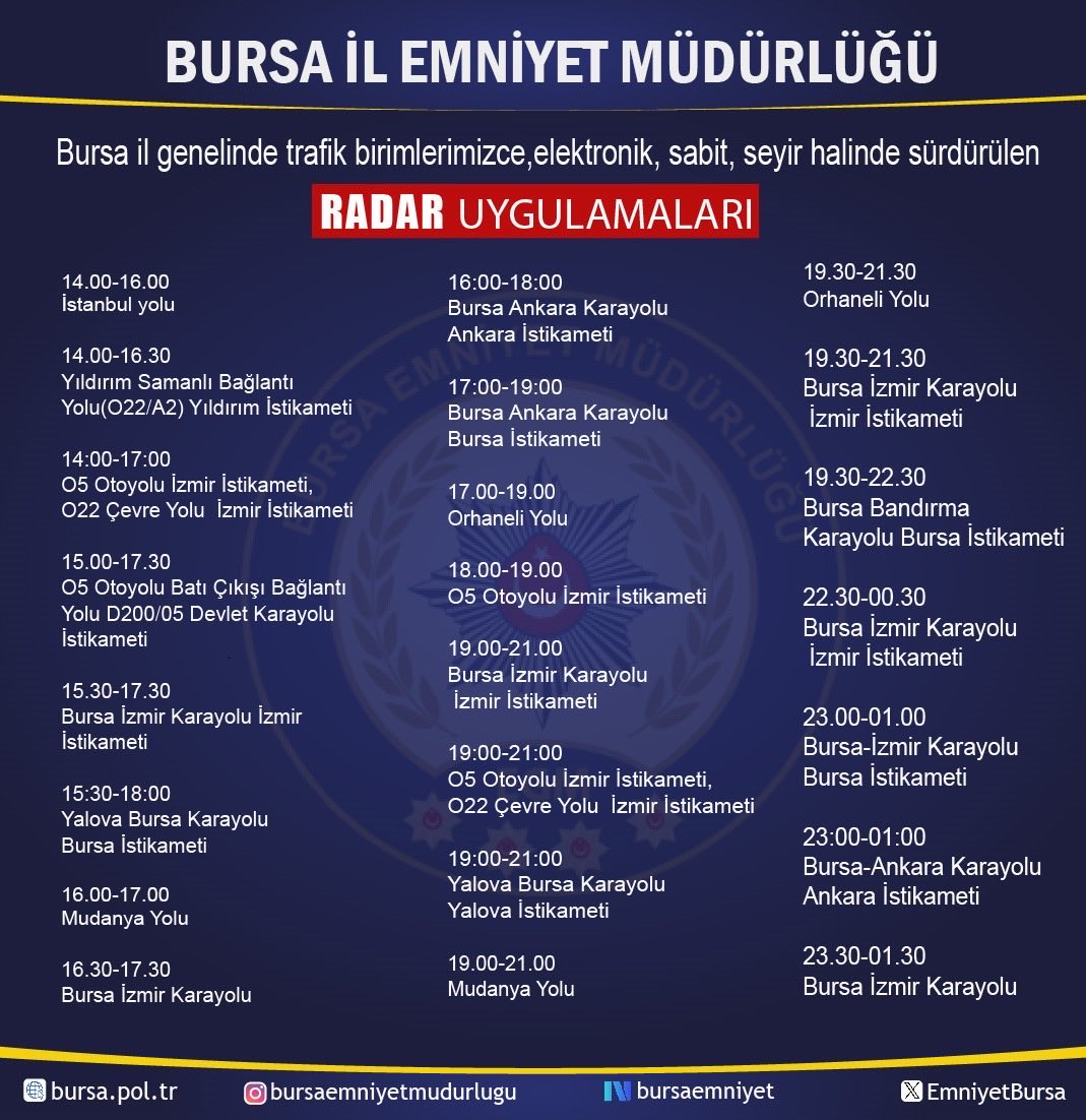 Bursa'daki radar denetimleri, erken saatlerden itibaren gece yarısına kadar devam edecek.