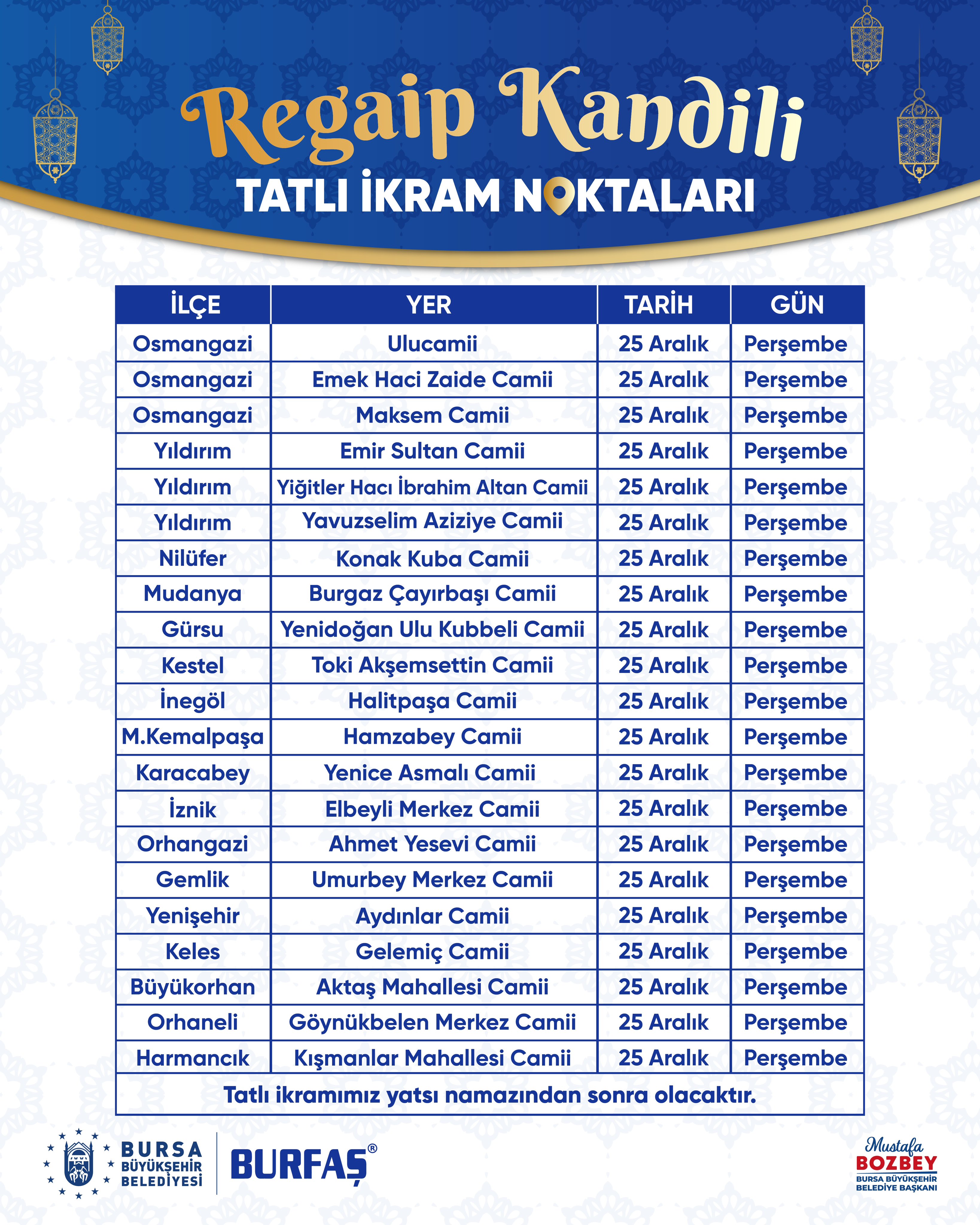 Bursa Büyükşehir Belediyesi, üç ayların müjdecisi olan Regaip Kandili’ni vatandaşlarla birlikte idrak etmek amacıyla kent genelinde tatlı ikramı düzenliyor. Belediye tarafından yapılan açıklamaya göre, 25 Aralık Perşembe günü yatsı namazının ardından, Bursa’nın 17 ilçesinde belirlenen camilerde vatandaşlara tatlı ikram edilecek.