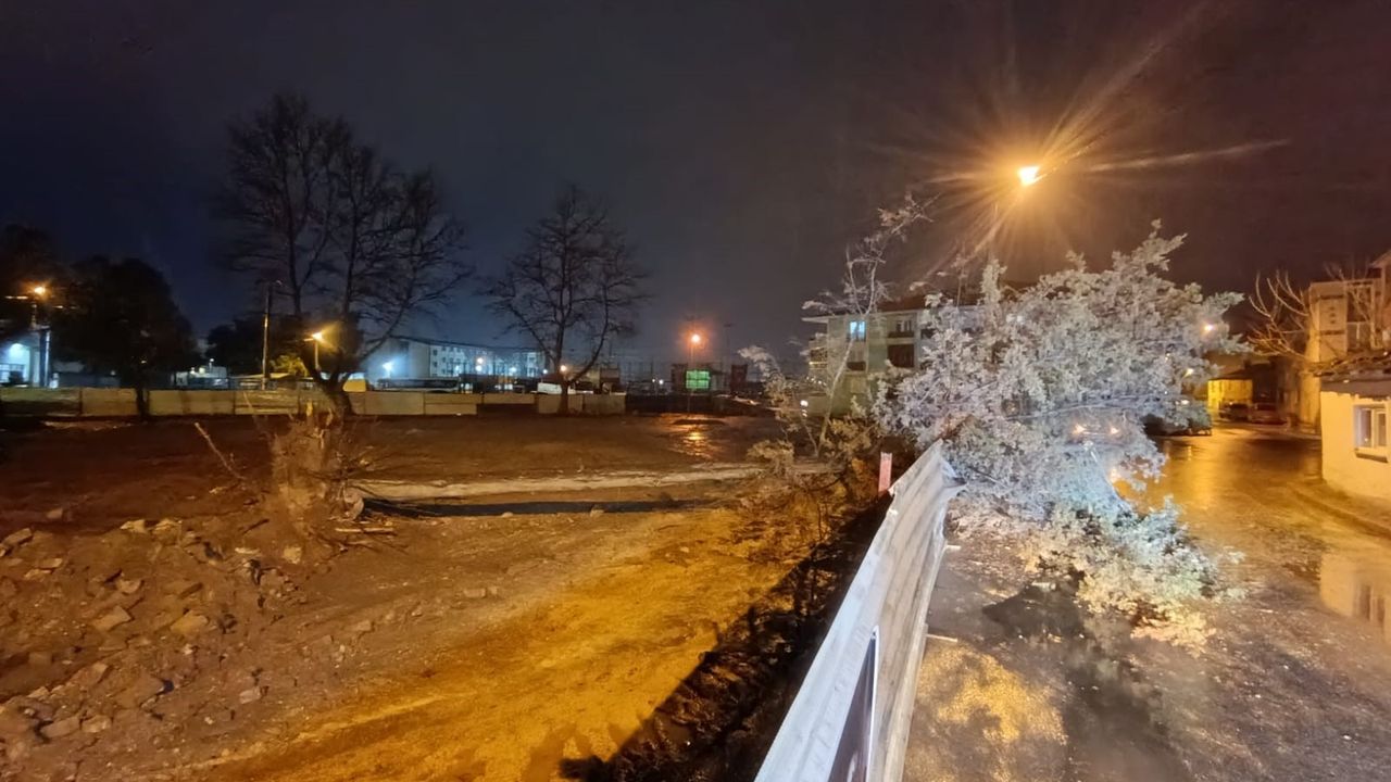 İnşaat alanında bulunan ağaç, yağış ve rüzgarın etkisiyle aniden kökünden çıkarak sokağa devrildi.