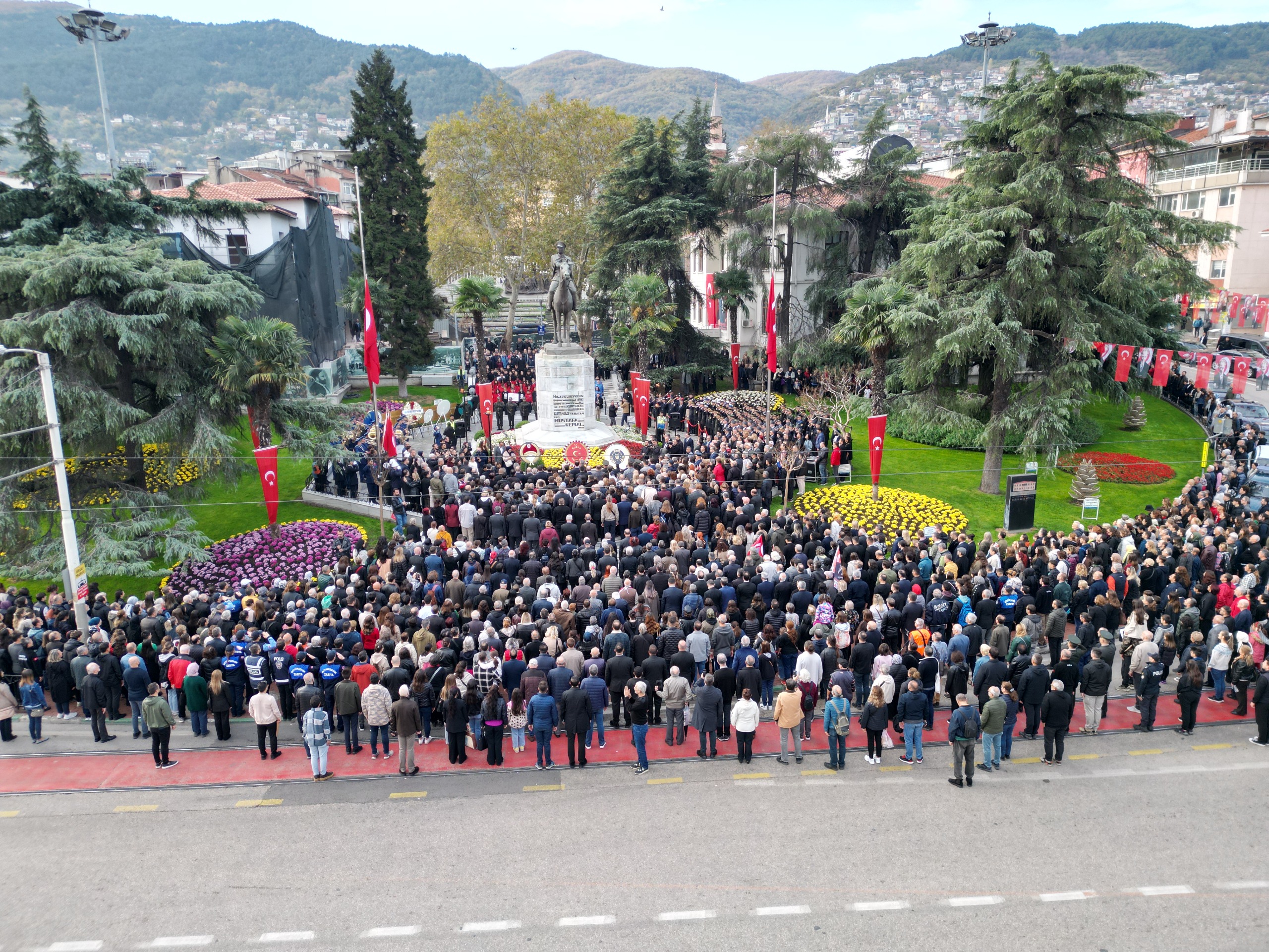 Bursa Valiliği tarafından Heykel’de düzenlenen anma programı, Bursa Valiliği, Bursa Büyükşehir Belediyesi ve Garnizon Komutanlığı’na ait çelenklerin Atatürk Heykeli'ne sunulmasıyla başladı. Saatler 09.05’i gösterdiğinde sirenlerin çalmasıyla birlikte Bursa’da hayat bir dakikalığına tamamen durdu. Vatandaşlar araçlarından inerek saygı duruşunda bulundu. Bazı vatandaşlar da törene cam ve balkonlarından eşlik etti. Saygı duruşu ve İstiklâl Marşı’nın okunmasının ardından Bursa Valisi Erol Ayyıldız, Büyükşehir Belediye Başkanı Mustafa Bozbey ve protokol üyeleri Büyükşehir Belediyesi tarafından Heykel UNESCO Meydanı’nda açılan ‘Bitmeyecek Kalbimizde Yolculuğun Sonsuza Dek’ sergisini gezdi. Vali Erol Ayyıldız, Büyükşehir Belediye Başkanı Mustafa Bozbey ve protokol üyeleri daha sonra Tayyare Kültür Merkezi’nde Özlüce Şehit Aykut Yurtsever Anadolu Lisesi öğrencilerinin sahnelediği ‘Türk'ün Destanı Atatürk’ oratoryosunu izledi.