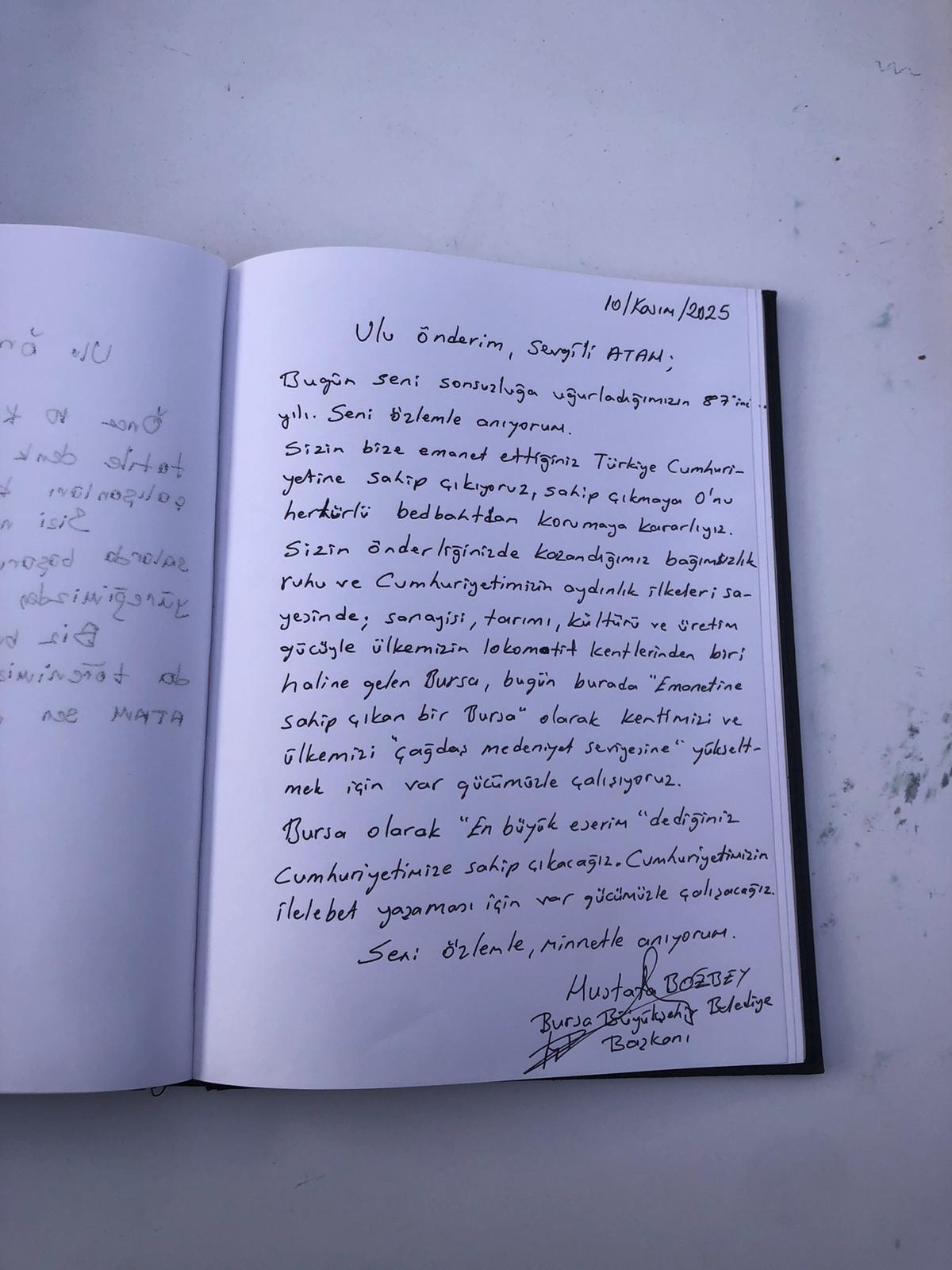 “Bugün seni sonsuzluğa uğurladığımızın 87. yılı. Seni özlemle anıyorum. Sizin bize emanet ettiğiniz Türkiye Cumhuriyeti’ne sahip çıkıyoruz, sahip çıkmaya O’nu her türlü bedbahttan korumaya kararlıyız. Sizin önderliğinizde kazandığımız bağımsızlık ruhu ve Cumhuriyetimizin aydınlık ilkeleri sayesinde; sanayisi, tarımı, kültürü ve üretim gücüyle ülkemizin lokomotif kentlerinden biri haline gelen Bursa, bugün burada ‘Emanetine sahip çıkan bir Bursa’ olarak kentimizi ve ülkemizi ‘çağdaş medeniyet seviyesine’ yükseltmek için var gücümüzle çalışıyoruz. Bursa olarak ‘En büyük eserim’ dediğiniz Cumhuriyetimize sahip çıkacağız. Cumhuriyetimizin ilelebet yaşaması için var gücümüzle çalışacağız. Seni özlemle, minnetle anıyorum”.