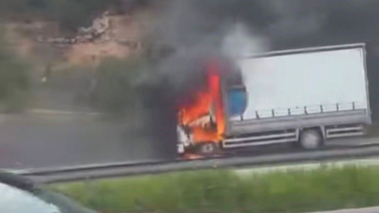 Kısa sürede büyüyen yangın kamyonu tamamen sararken, sürücü aracı yol kenarına çekerek kendini dışarı attı.