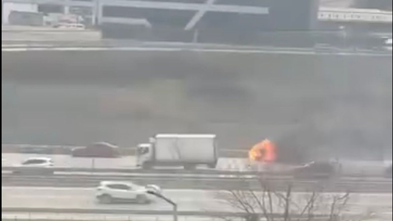 Yangını fark eden sürücü, aracı durdurmaya çalışarak kendisini son anda dışarı atmayı başardı.