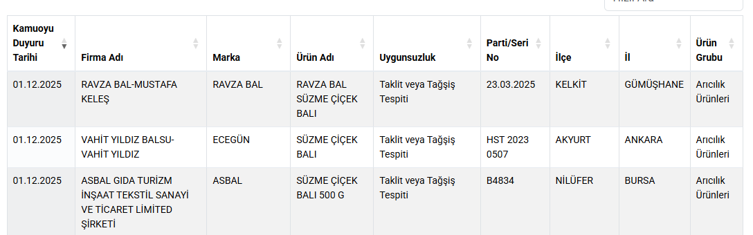 Aynı listede Gümüşhane ve Ankara’da üretilen bazı bal ürünlerinde de benzer uygunsuzluklar tespit edildi.