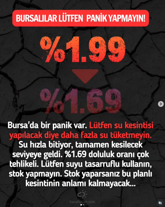 Bursa’da yaşanan kuraklık ve barajlardaki hızlı düşüş, kenti su kriziyle karşı karşıya bıraktı. Hava forum sosyal medya platformlarında yapılan paylaşımlarda, su doluluk oranının %1,69 seviyesine indiği belirtilerek vatandaşlara “Panik yapmayın, suyu tasarruflu kullanın” çağrısı yapıldı.