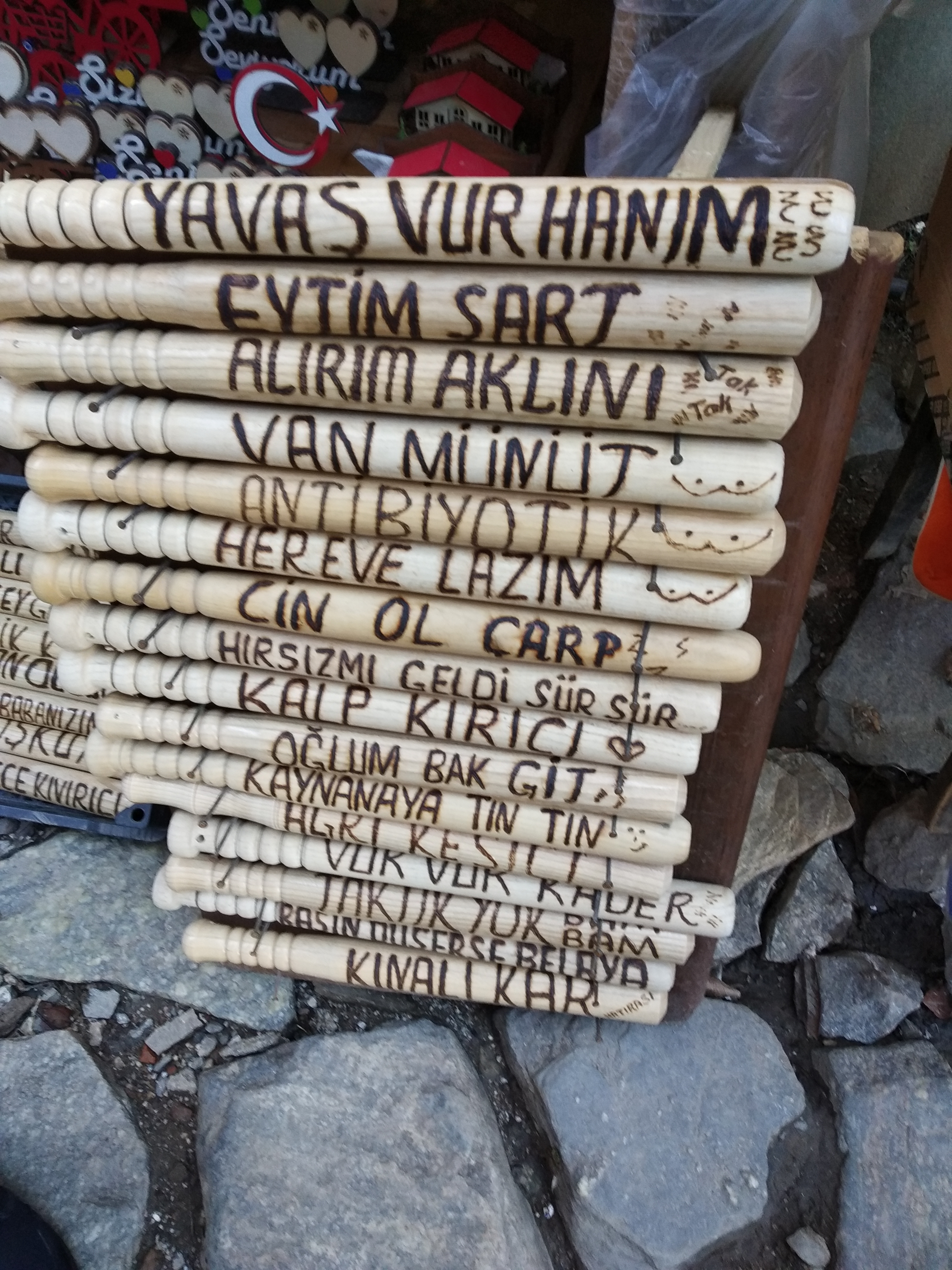 Özellikle üzerinde “Akıllı ol”, "Kemik kırıcı", “Aklını alırım” ve “Her eve lazım” gibi ifadeler bulunan ahşap sopalar görenleri şaşkına çeviriyor. Şiddeti çağrıştırdığı belirtilen bu ürünlerin, Osmanlı mirasıyla bağdaşmadığı ifade ediliyor.