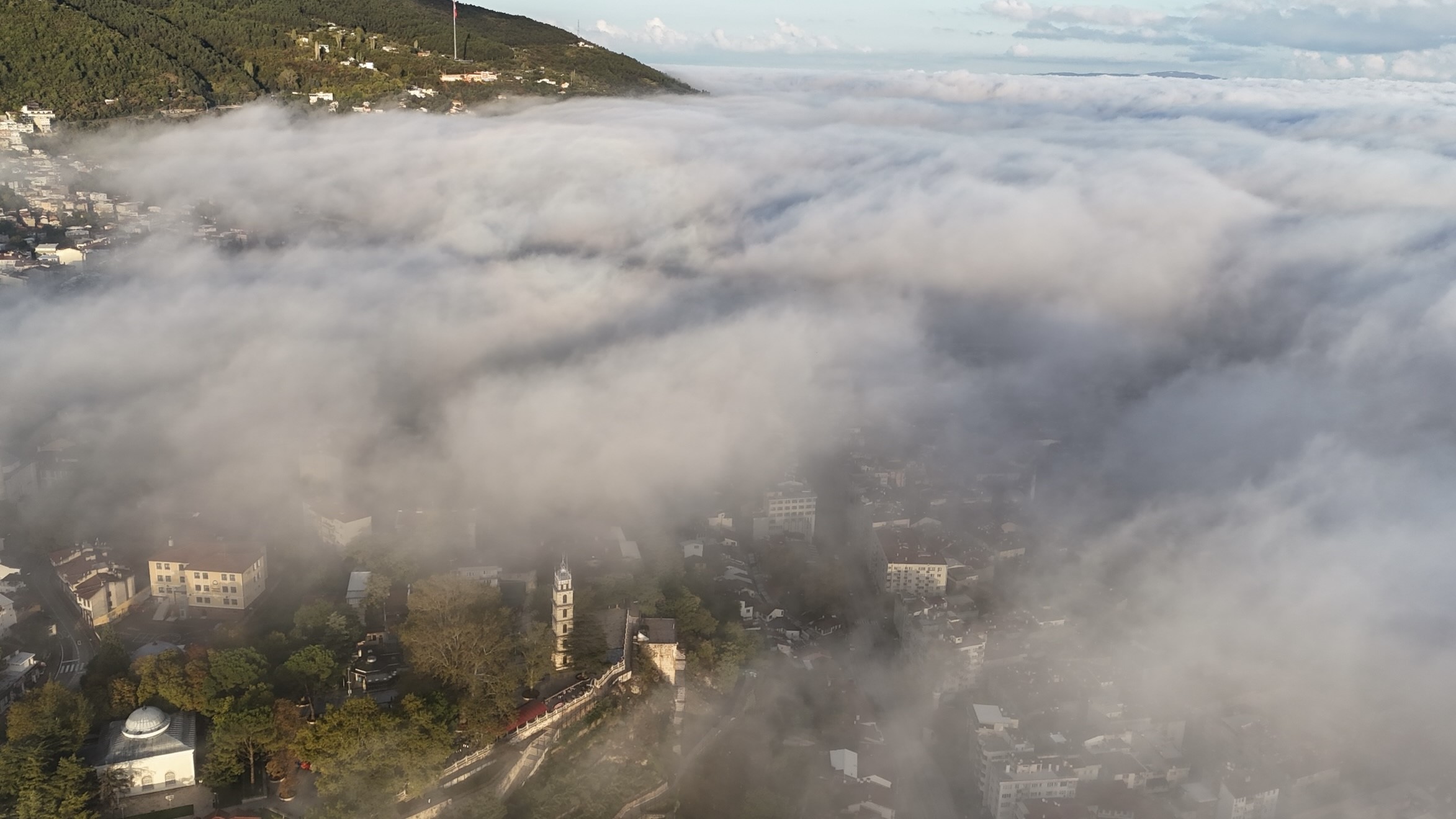 Drone ile havadan görüntülenen Bursa'da binalar sis bulutlarının arasında kaybolurken, pamuklara bürünmüş bir Bursa gibi izleyenleri mest etti. Bursa'nın simgesi olan Ulu Cami, Tophane ve önemli tarihi mekanların sis altındaki görüntüleri büyüledi. Ortaya çıkan görsel şölen, izleyenler tarafından büyük beğeni kazandı.
