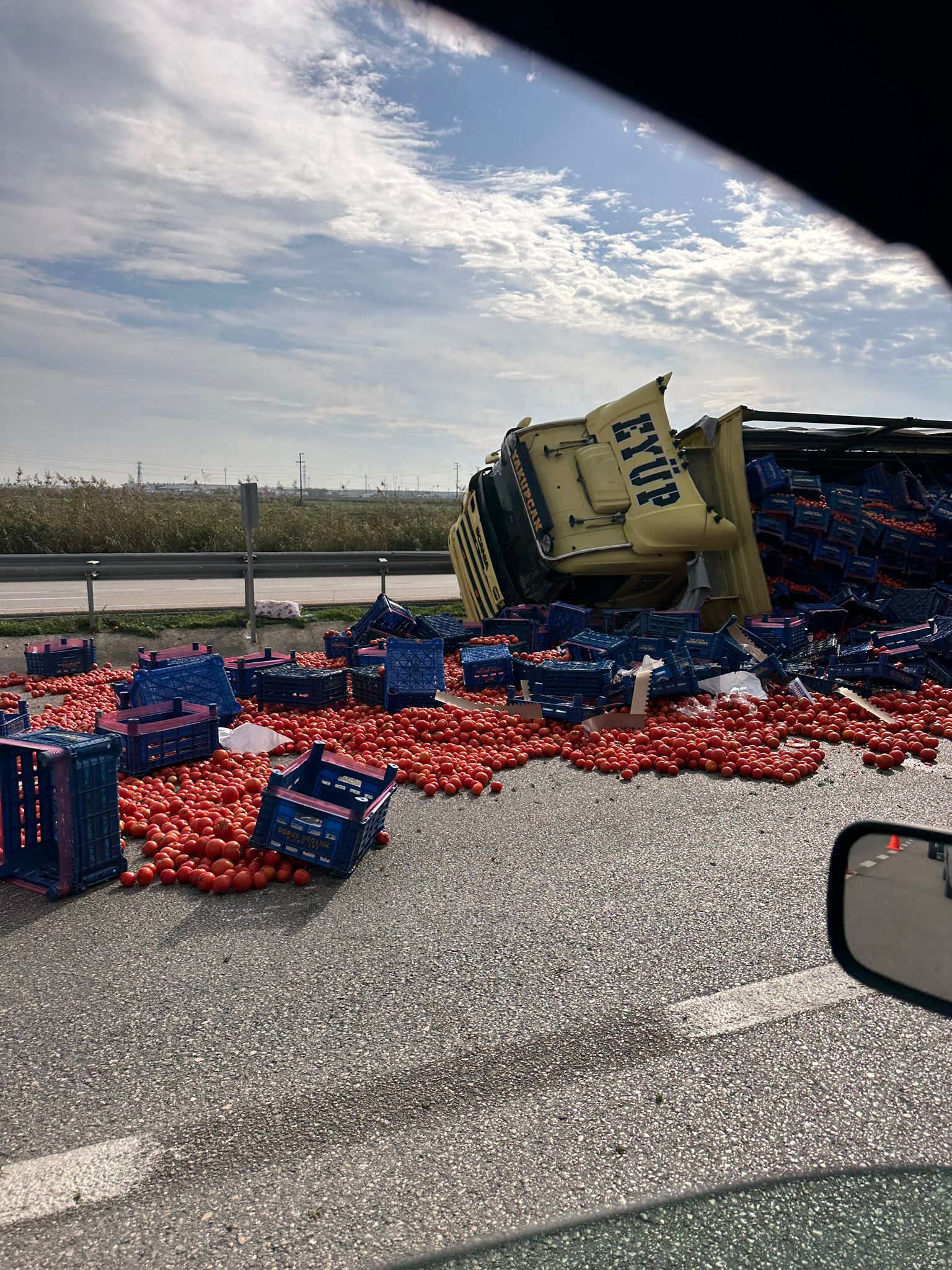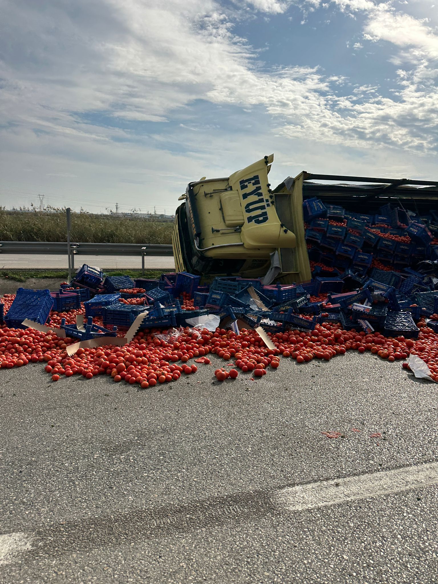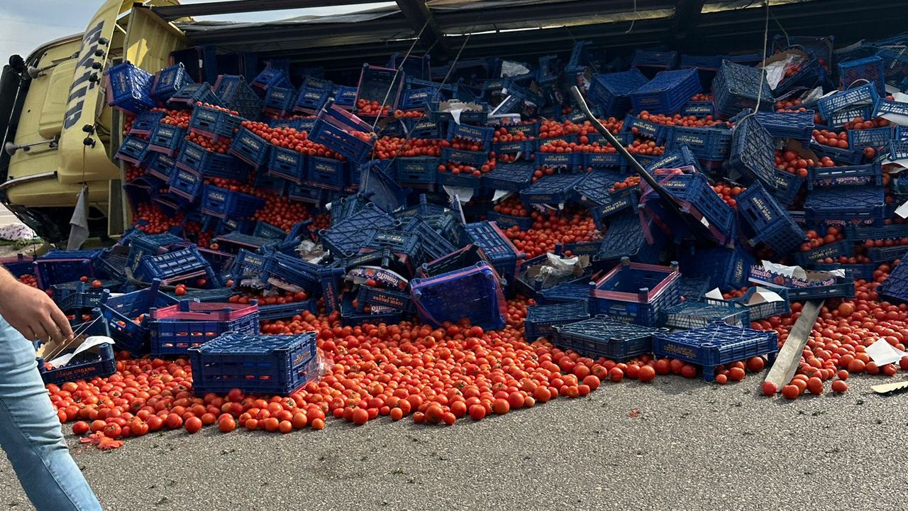 Tırın devrilmesi sonucu yüklenen domatesler yola saçılırken, trafik kısa süreliğine kontrollü olarak sağlandı.