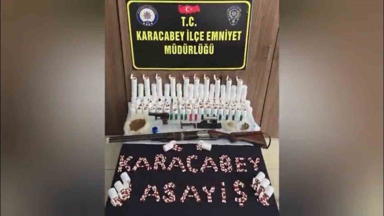 Bursa’nın Karacabey ilçesinde Uyuşturucu veya Uyarıcı Madde İmal ve Ticareti suçuna yapılan operasyonda 2 şüpheli yakalanırken çok sayıda uyuşturucu ve silah ele geçirildi.