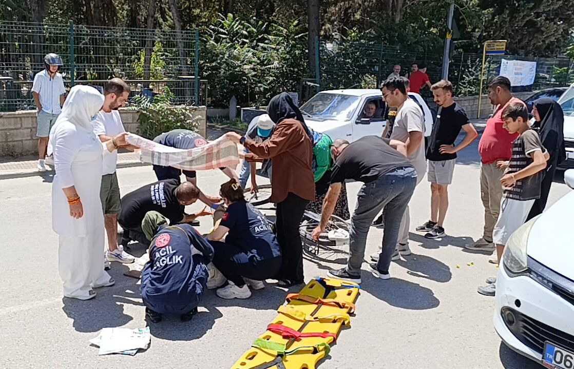 Bursa’nın İnegöl ilçesinde meydana gelen kazada otomobilin çarptığı bisikletli yaralandı. Vatandaşlar, yaralanan adamın üzerine örtü tutarak onu güneşten korudular.