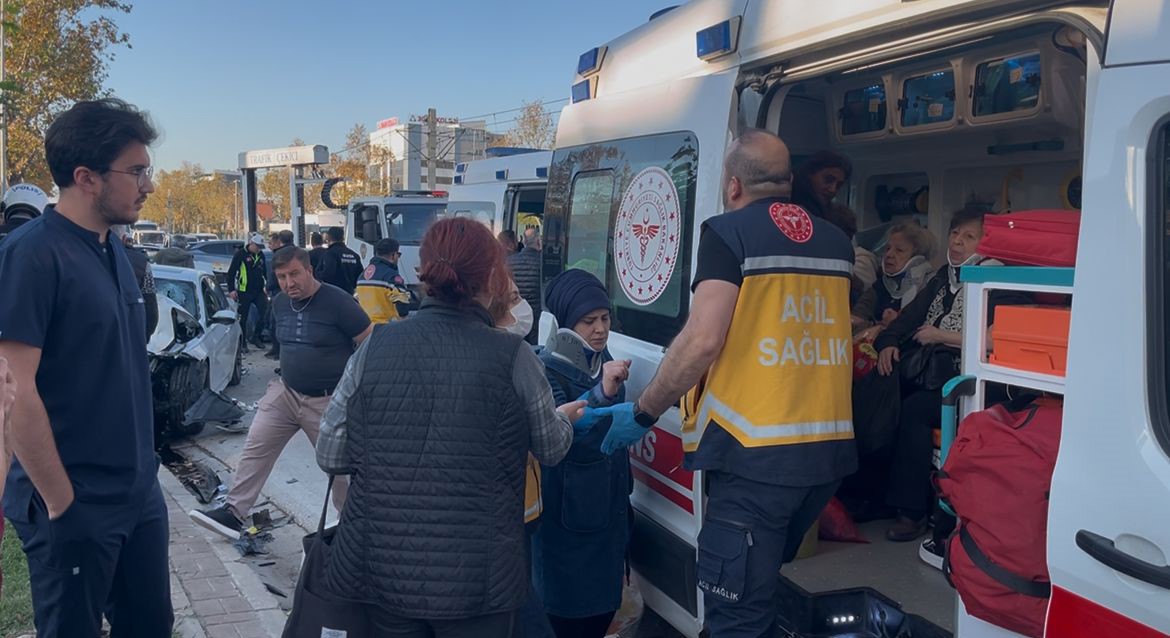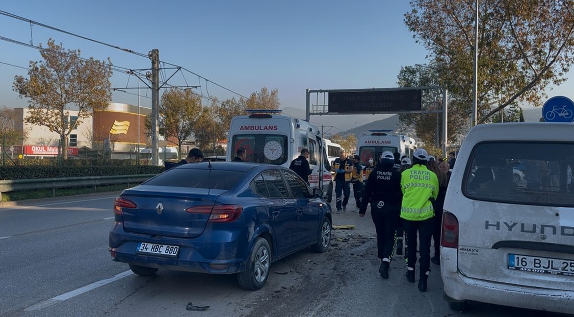 Bursa’da iddiaya göre yarış yapan iki otomobil kontrolden çıkarak önce belediye otobüsüne ardından kaldırıma çarptı. Kazada 13 kişi yaralandı.