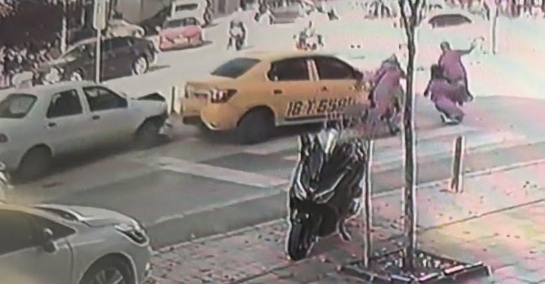 Olay, saat 12.00 sıralarında İnegöl ilçesi Sinanbey Mahallesi Ahmet Akyollu Caddesi’nde meydana geldi. Güvenlik kameralarına yansıyan olayda, cadde üzerinde seyir halinde sürücü İlhan K. (36) yönetimindeki 16 T 5589 plakalı ticari taksi, yaya geçidinden geçen yayaları görünce durdu. Aynı yöne seyreden Cihan D. (36) yönetimindeki 16 AAK 408 plakalı otomobil, taksinin durduğunu fark etmeyerek, önündeki ticari taksiye çarptı. Çarpmanın etkisiyle hızlanan ticari taksi, yaya geçidinden geçmekte olan anne Merve A. (29) ve bebek arabasındaki 2 yaşındaki Miraç A.’ya çarptı.